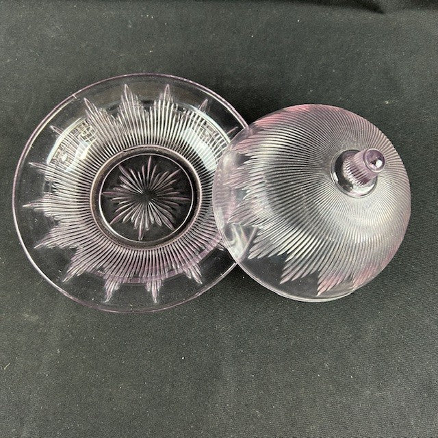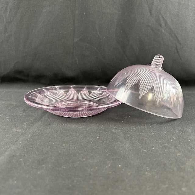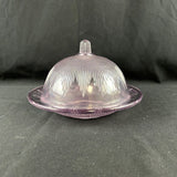 Vintage Amethyst pressed glass covered dish. Perfect for butter or small biscuits. Charming ribbed pattern. Measures; 7"W x 5"H. In excellent condition.