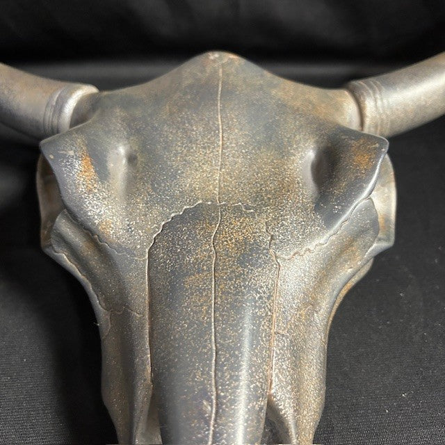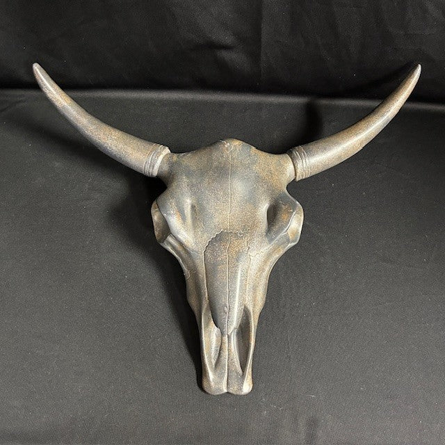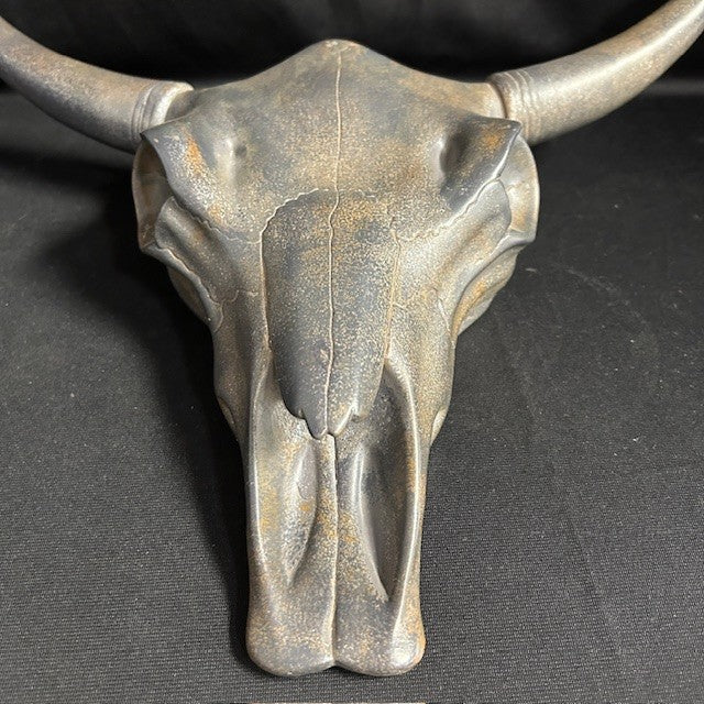 Large longhorn bust crafted from blackish gray resin and speckled with brown and white paint for an aged patina look. Measures 17.625"L x 3"W x 13"H. In great condition. Holes in the back for easy hanging.