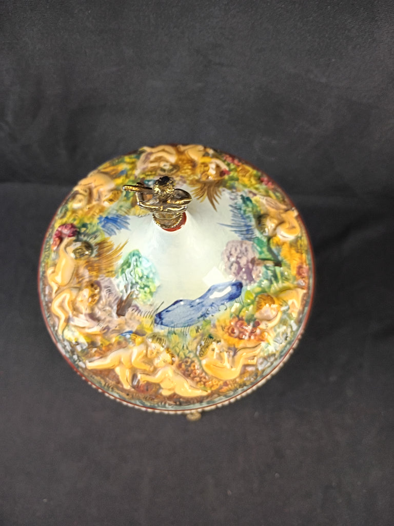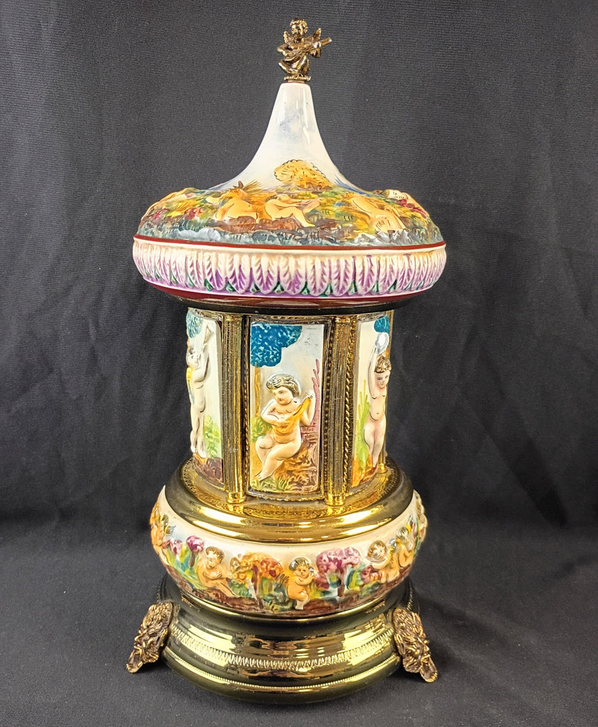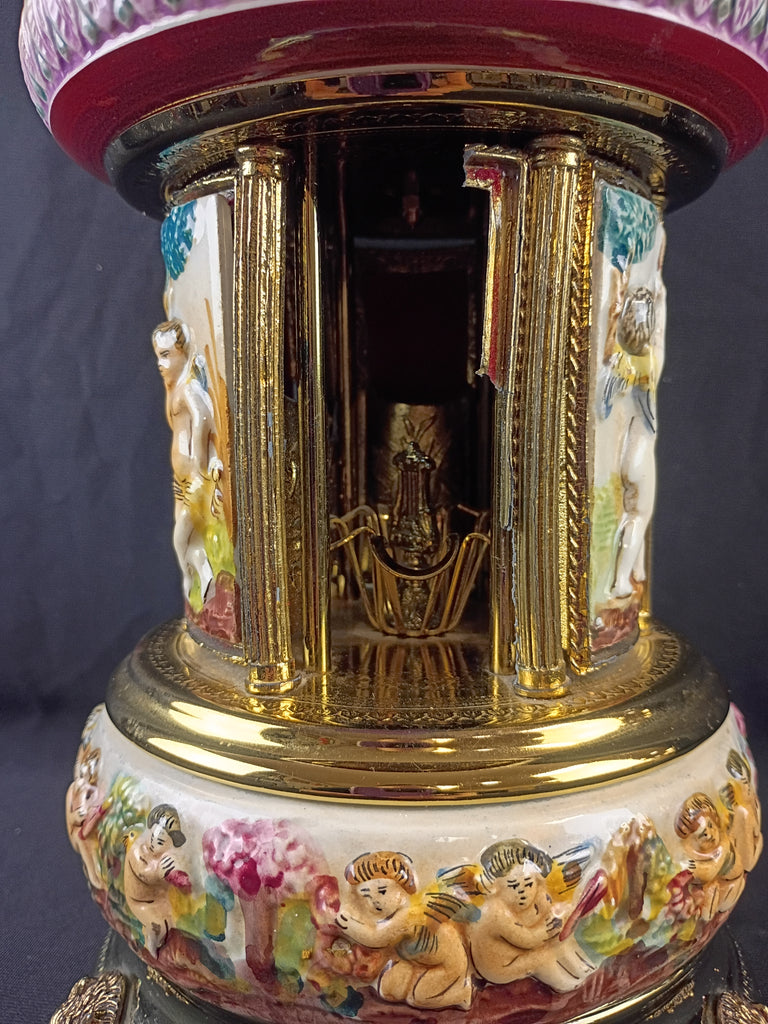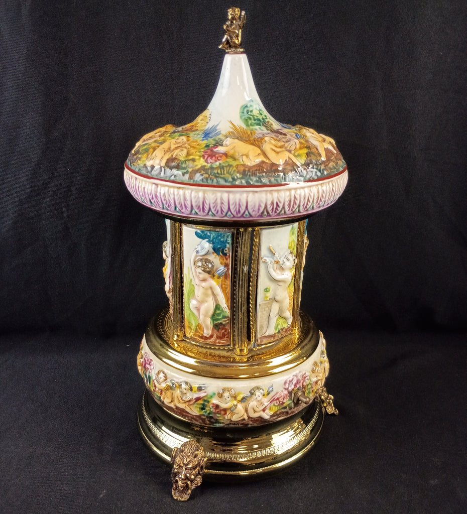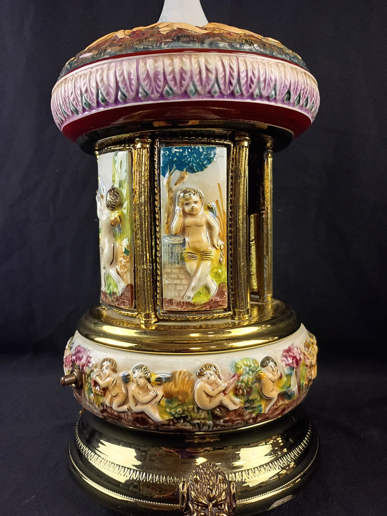 Capodimonte carousel. Sells for $200-$300 working, this one is missing a panel and was overwound so is no longer functioning, but still a beautiful decor piece. Measures 14"H x 7"W.