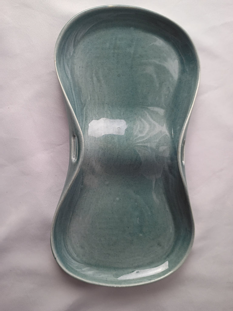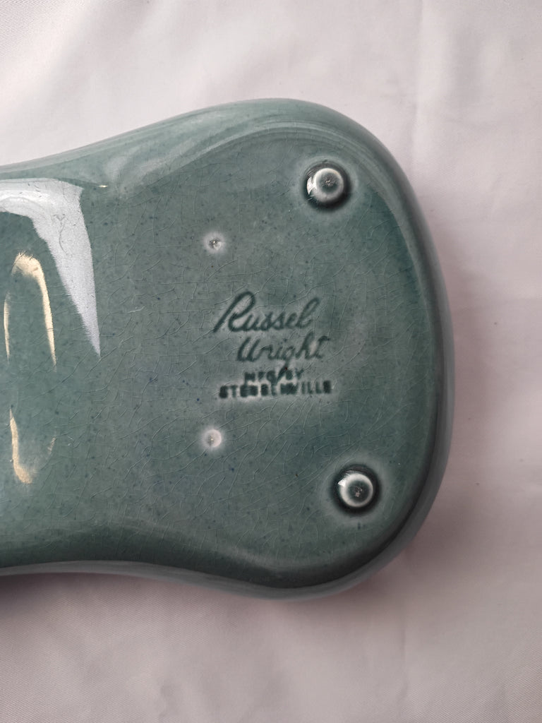 Russel Wright Steubenville American Modern Seafoam Green. Relish or celery tray, missing the original rattan handle, otherwise in excellent condition. Measures 10"L x 5.5"W x 1.5"H.
