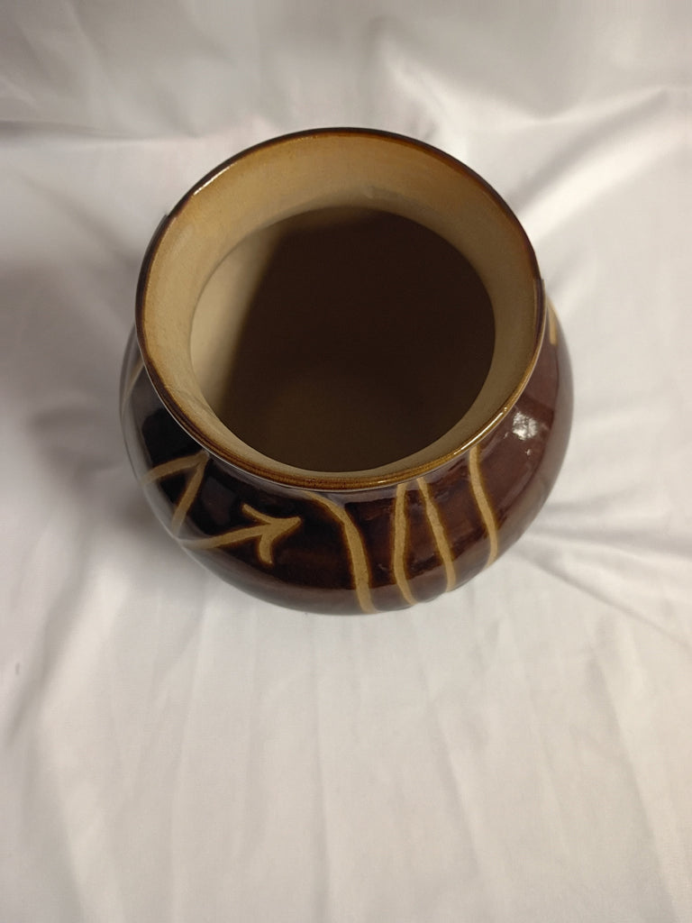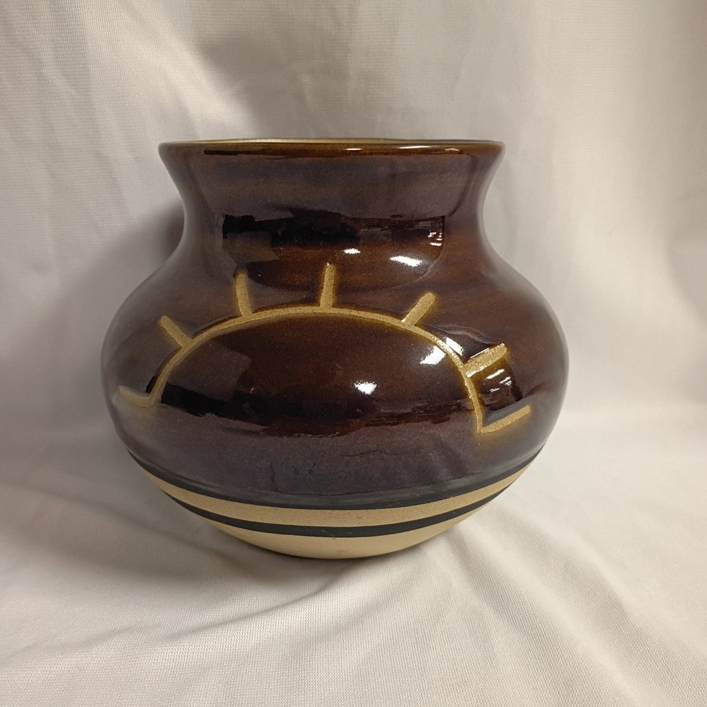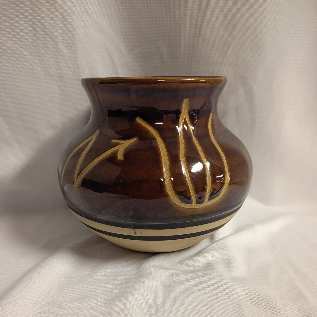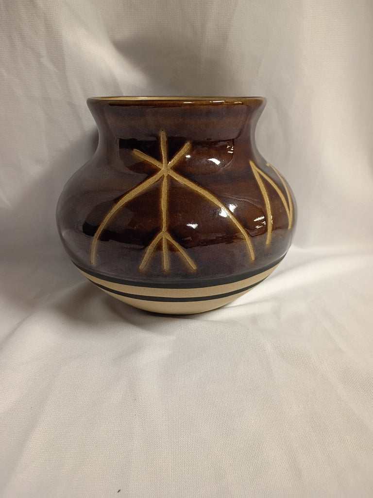 Saguaro Stoneware vase. In excellent condition. Engraved glazing with different tribal-like symbols. Measures 6"H x 4.5"w.