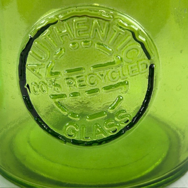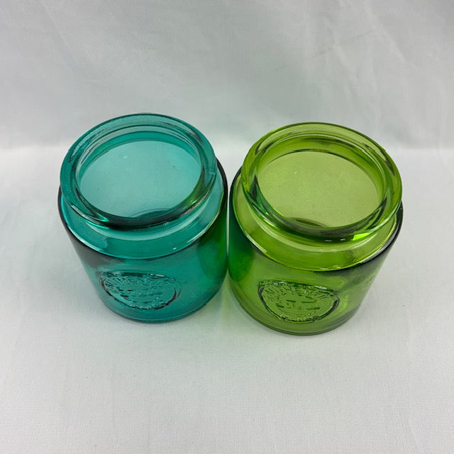 San Miguel 100% Recycled Green and Aqua glass canisters. Made in Spain. Each measures 5"H x 4"W. Both in excellent condition.