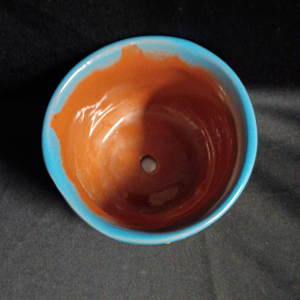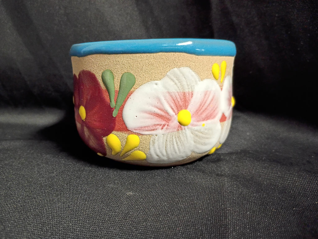 Mexican art pottery planter. Floral motif. Glazed accents and interior. Measures 3"H x 4"W. In excellent condition.