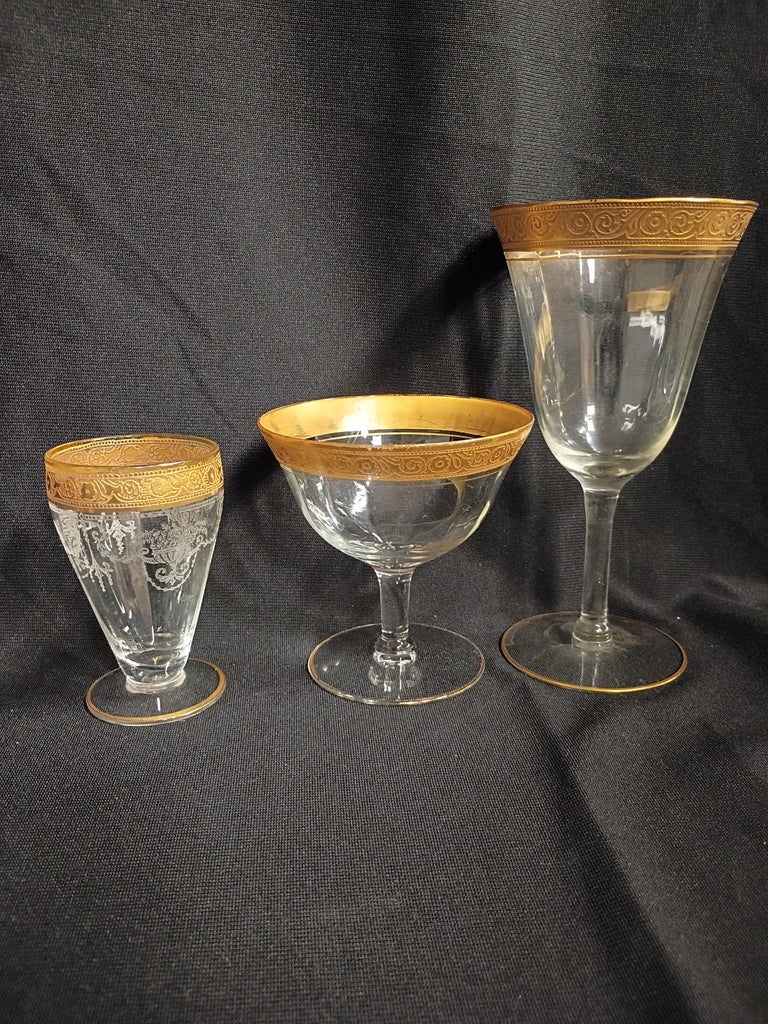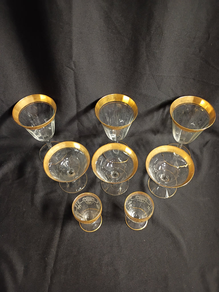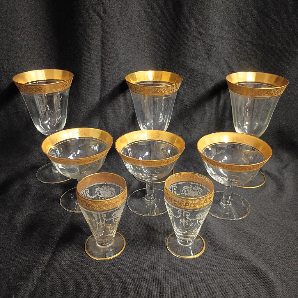 Set of 8 Tiffin-Franciscan rambler rose pattern glasses. Includes 3 goblets, 3 champagnes, and 2 cordials. Goblets measure 6.5 x 3.5, champagnes are 4 x 4 and cordials are 3.5 x 2.5. Some wear on the gold, otherwise in excellent condition.