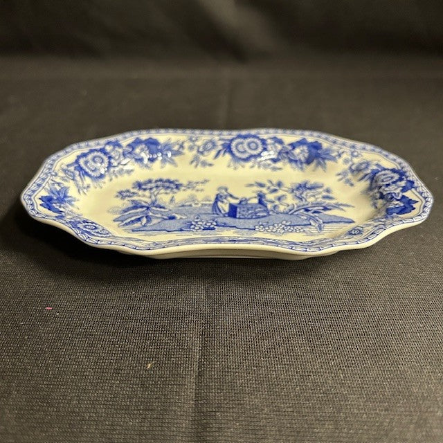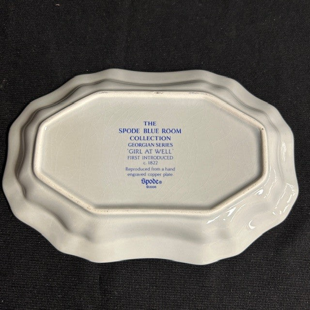 Great condition, part of the Blue room collection, scalloped edges that accents the dish. Great for trinkets, candies, or a decor piece. launched in 1816 part of the "Blue Italian" collection, showing a sweet picture of a girl at the well! inspired by the Italian countryside. Measurements are 6.5"W x 4.5"L.