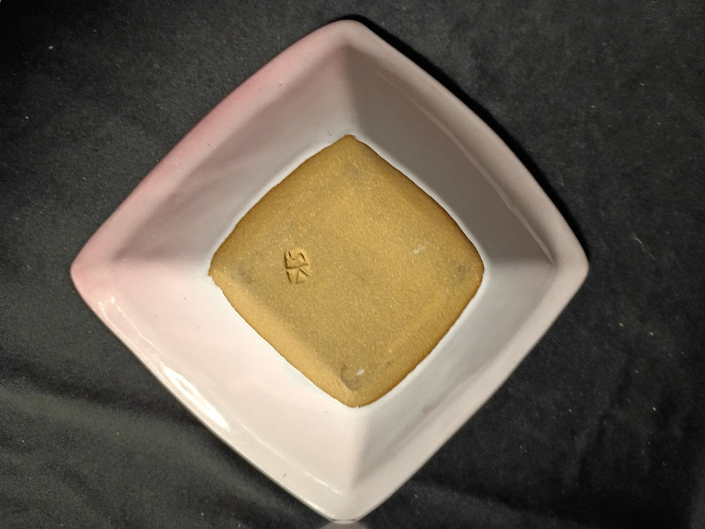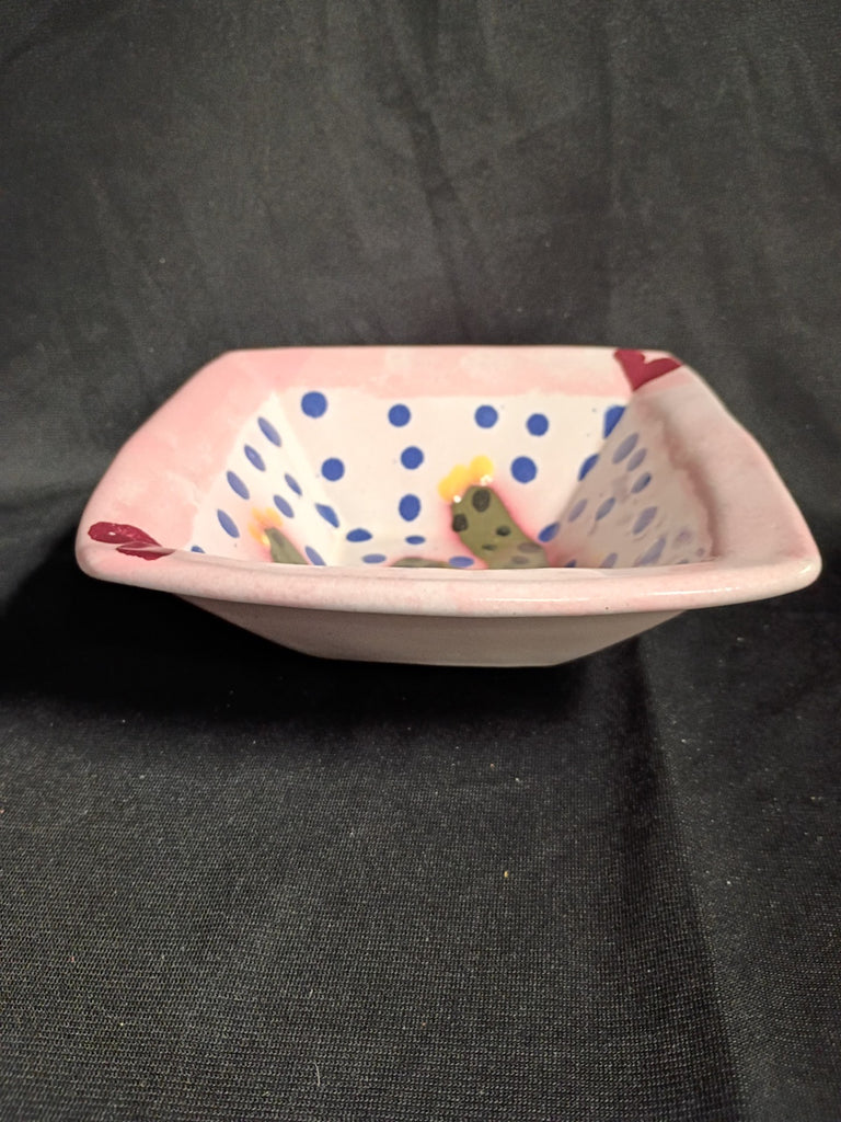 "El Rancho" art pottery bowl by Stephen Kilborn. Signed at the bottom. Saguaro cactus and blue dot design. In excellent condition. 7" square x 2" deep.