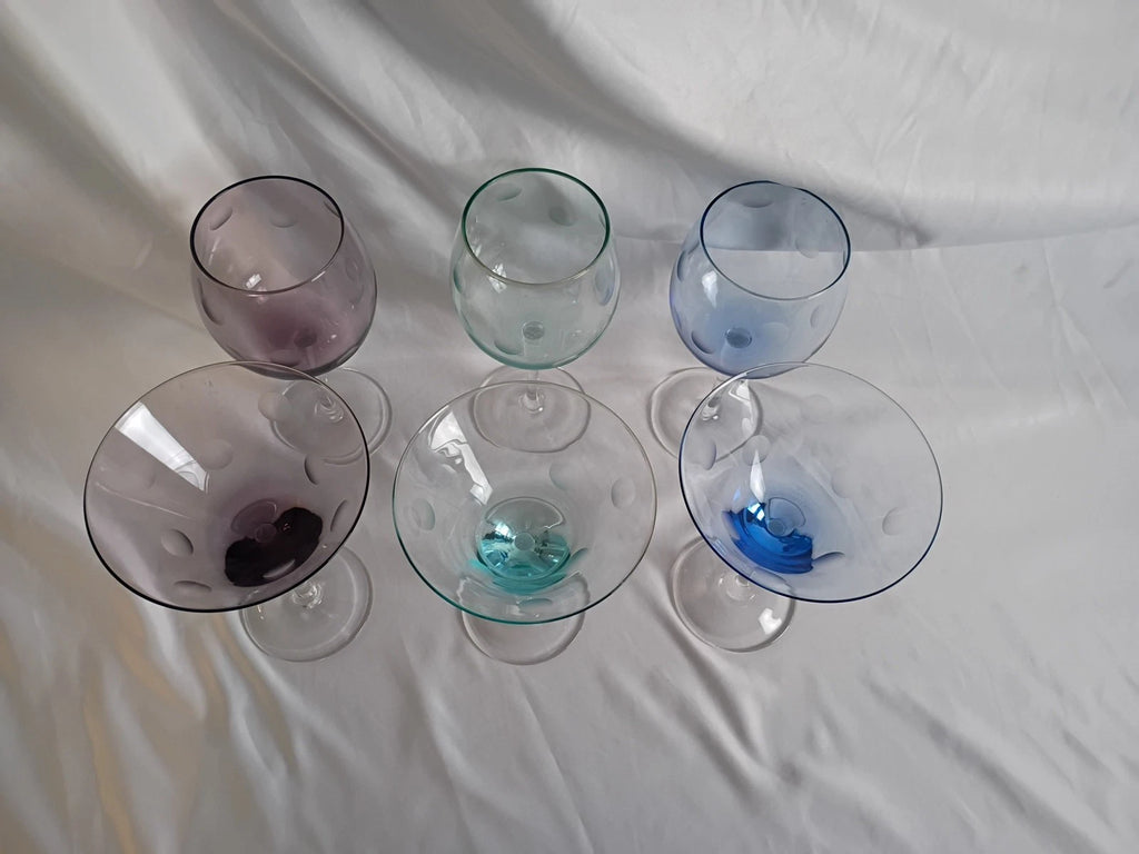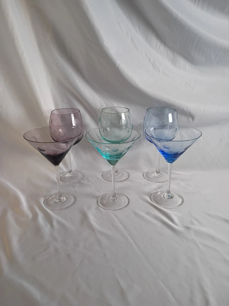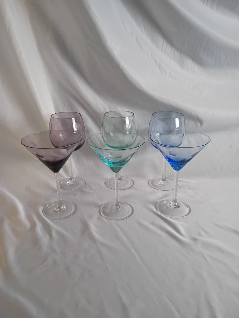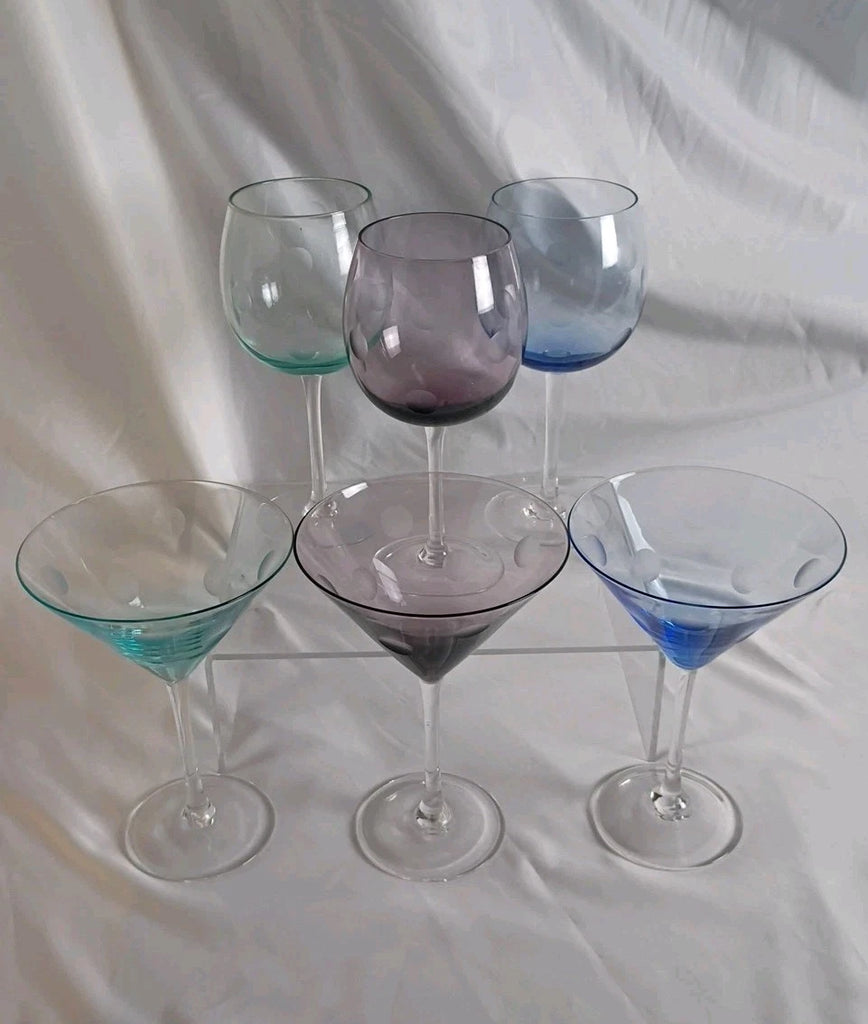 Set of 6 Marquis by Waterford barware glasses. Three martinis measuring apps 7.75"H x 5.25"W in green, blue, and purple, and three wine goblets in the same color palette that measure appx 9"H x 3.75"W. All 6 glasses have a fun etched polkadot pattern! All hallmarked at the bottom and in excellent condition.
