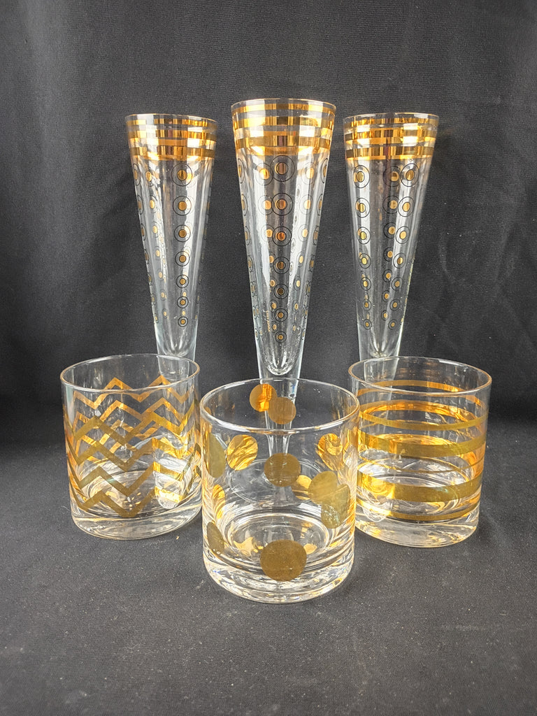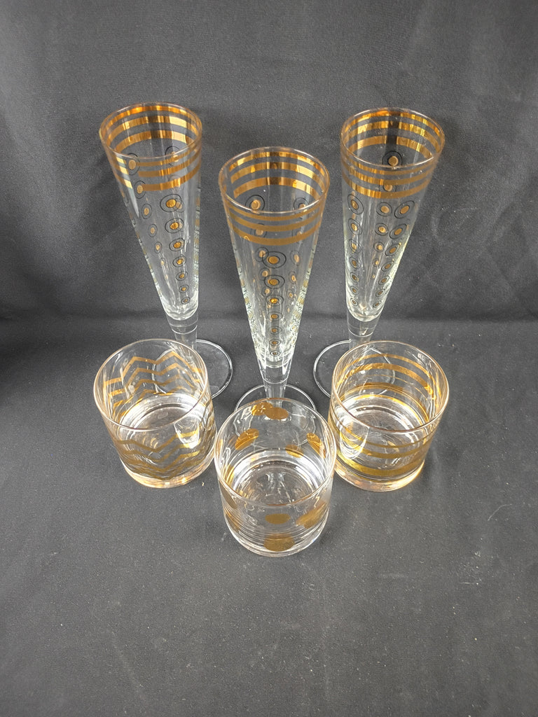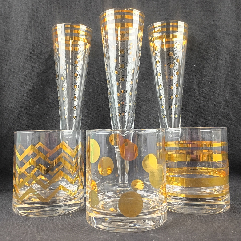 Set of 6 fun cocktail glasses. Three are Ritzenhoff champagnes with striped rims and polka dot bodies designed by Ana Gili. The champagnes measure appx 10"H x 3"W each. Three are unbranded rocks glasses each with a striped, polka dot, and zigzag design, respectively, measuring 4"H x 3"W. Some minor wear to the gold designs, but overall all pieces are in excellent condition, and make a lovely barware set!