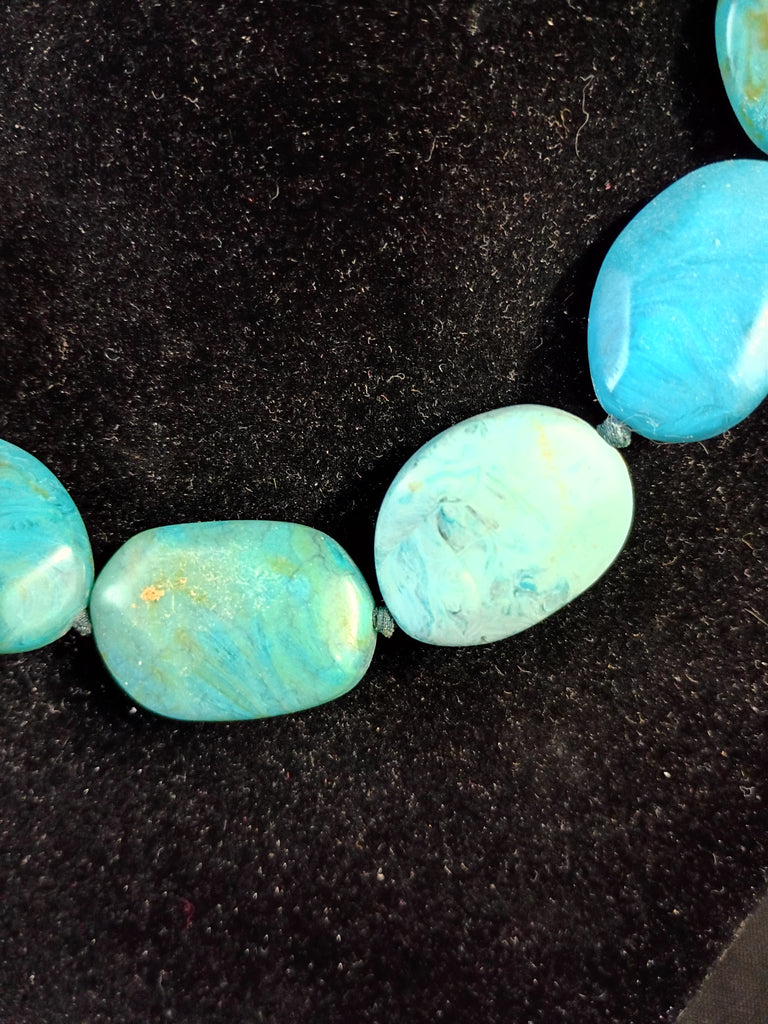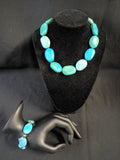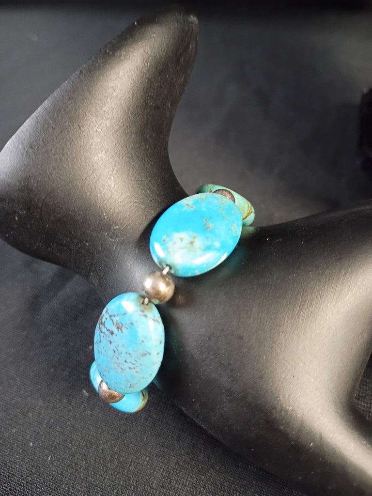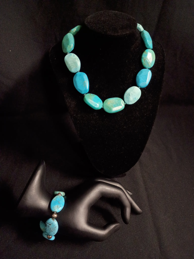 Sterling silver & genuine turquoise bracelet measuring 8"L x 0.62"W, faux turquoise bead necklace measuring 18"L both in great condition.