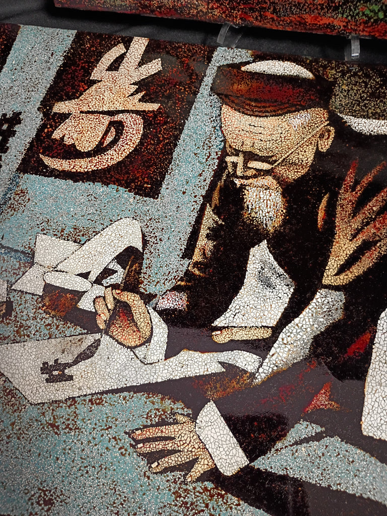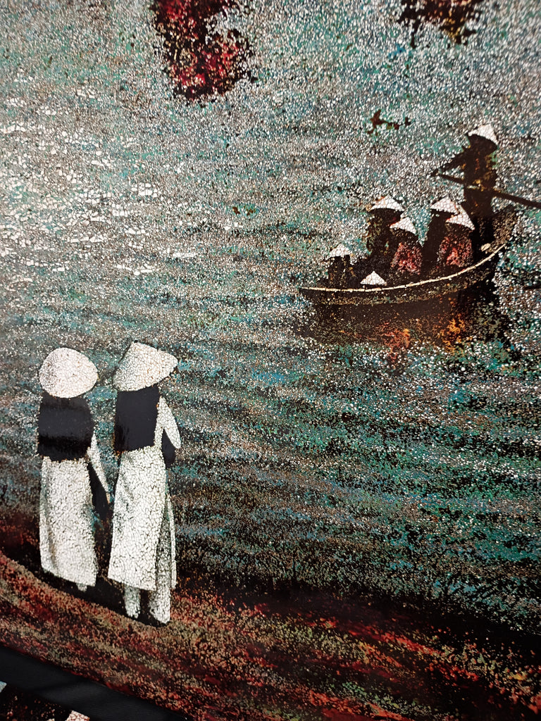 Two wood lacquer eggshell Asian wall art pieces. One illustration depicts two women watching a boat on the lake, the other is a scholar writing. Both are in excellent condition and measure 16" x 24".