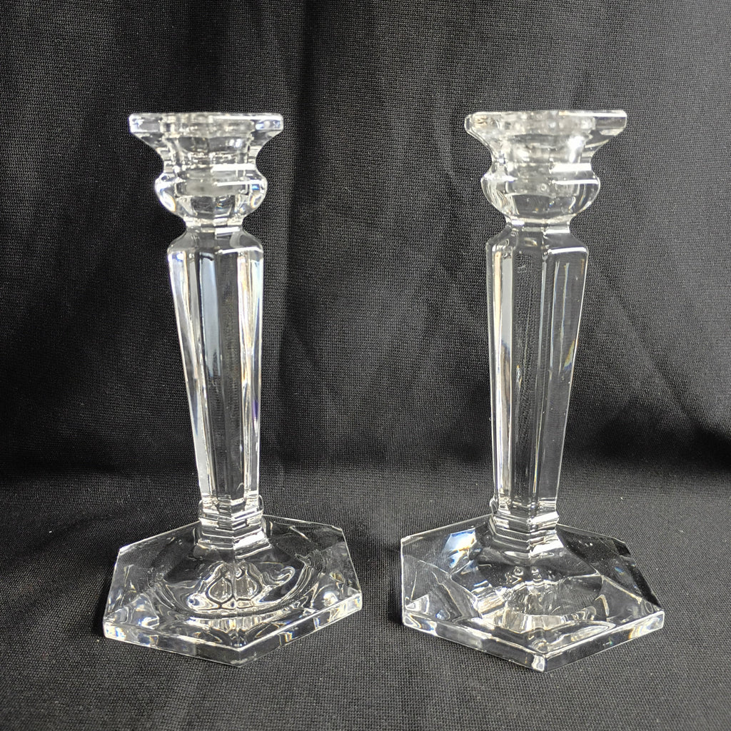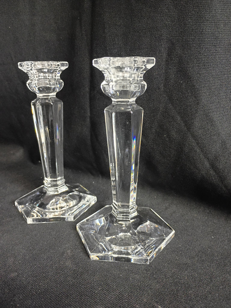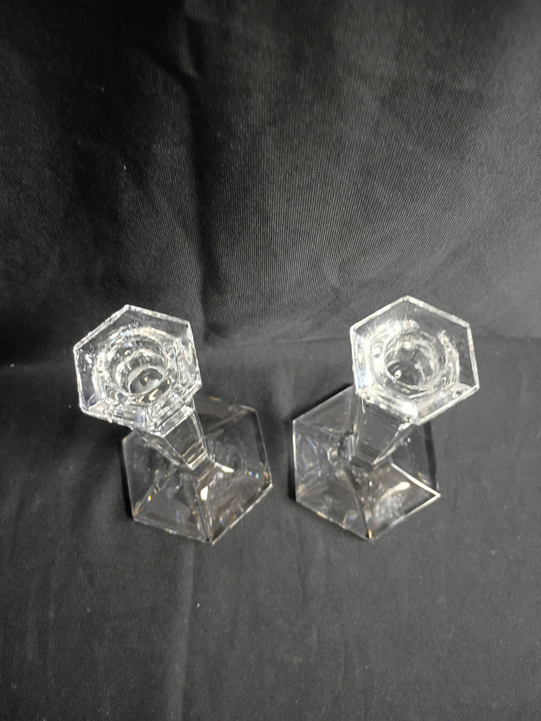 Two 6.5"H x 4"W crystal candlesticks. Hexagonal bases. In great condition.