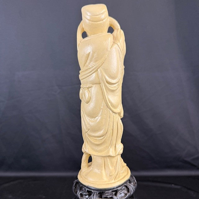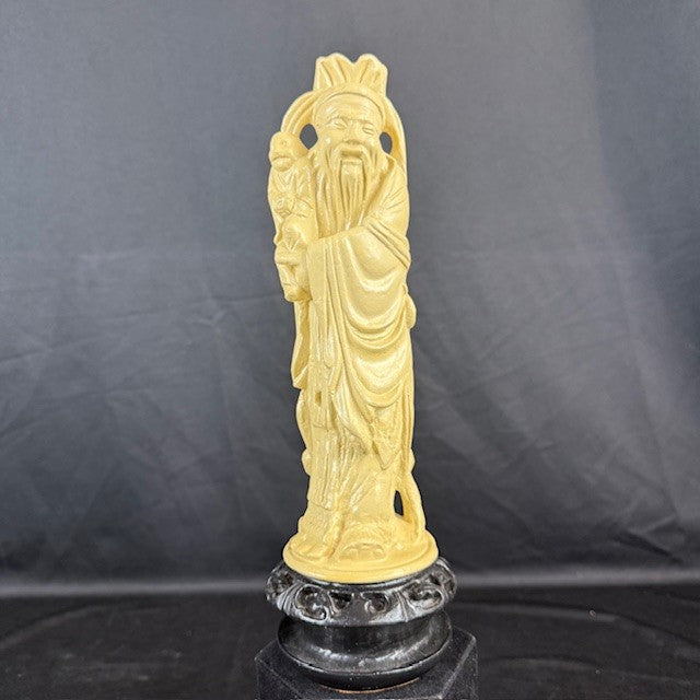 Two vintage Chinese carved wooden painted figurines. Each depicts an elderly man standing on black wooden platforms. Each measures 10.5"H x 3.5"W. Both in excellent condition.