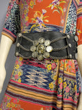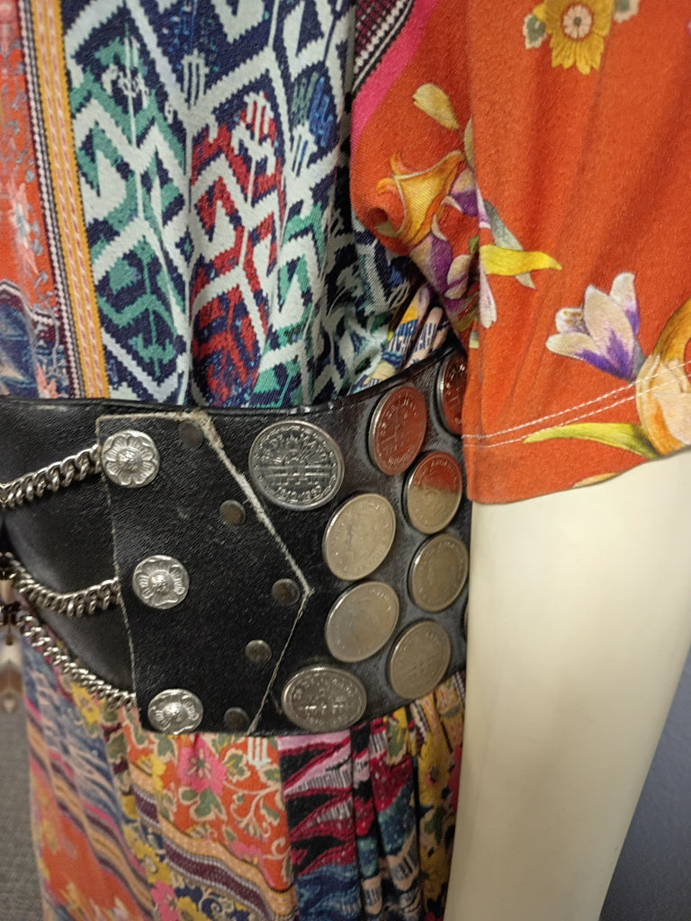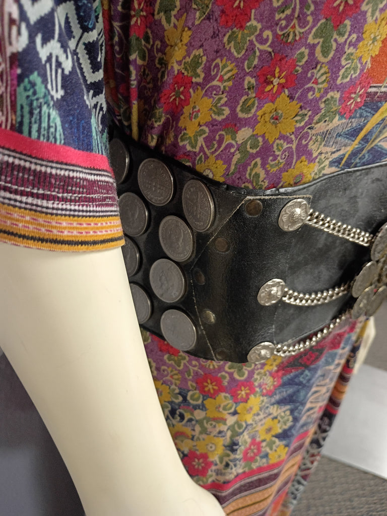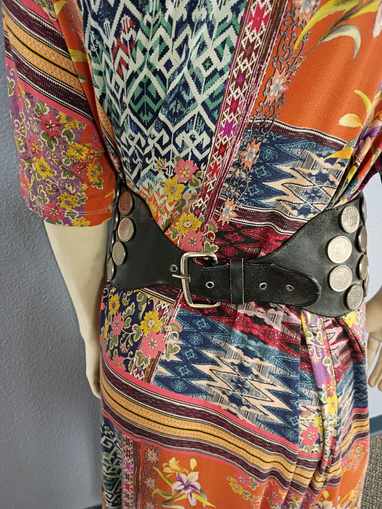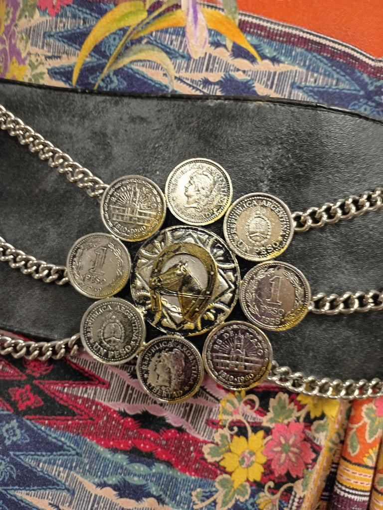 This vintage Argentinian black leather gaucho belt is a statement piece with metal details and coins. Measuring 42 inches, it is handmade and suitable for men. The belt is a gaucho design and is perfect for special occasions. The decade of manufacture are unknown, but it is an original piece from Argentina. The material is leather, and the brand is Handmade. Coins are attached with rivets. Yellowing on some of the coins, otherwise in good shape.