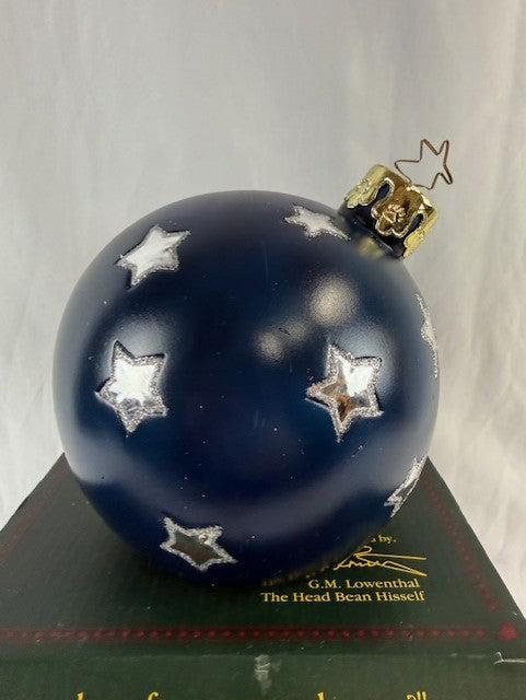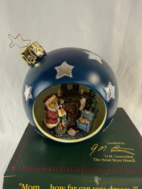 Vintage 2002 Little Snoozle Night Before Christmas Ornament. Outside blue with silver stars, inside cute Christmas scene. New in box. Dimensions 7"L x 7"W x 6"H.