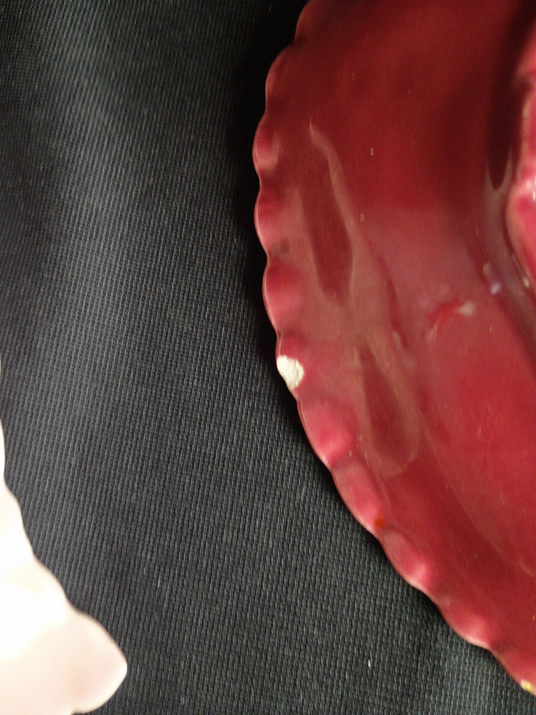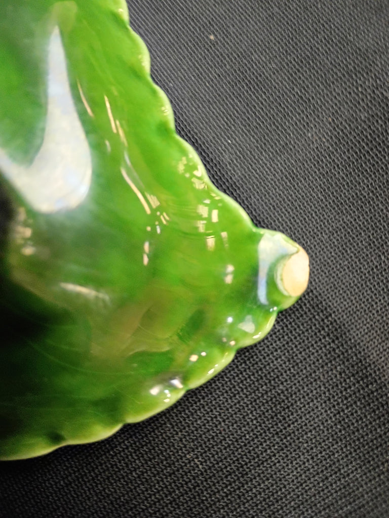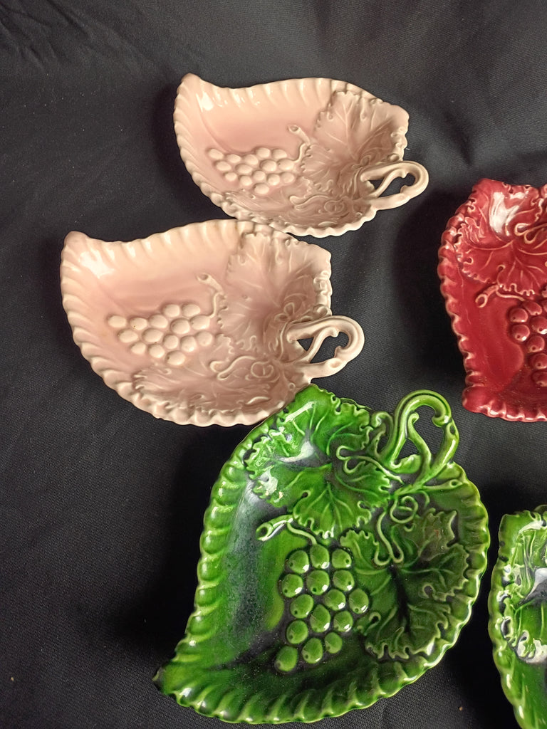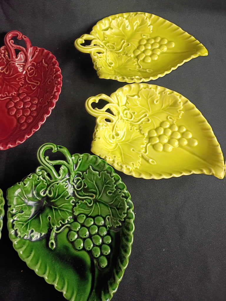 These are vintage Cemar dishes featuring a distinct leaf shape with a small handle and ruffled scalloped edges. Grape pattern on the interior. Each is marked on base with "Cemar, MADE IN CALIF 930. Measures: 7"L x 5"W. 2 yellow; 2 green; 2 pink and 1 red. Two have small chips on the reverse (see last two photos). Otherwise all in great condition!