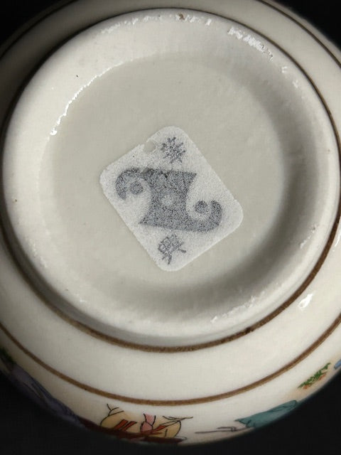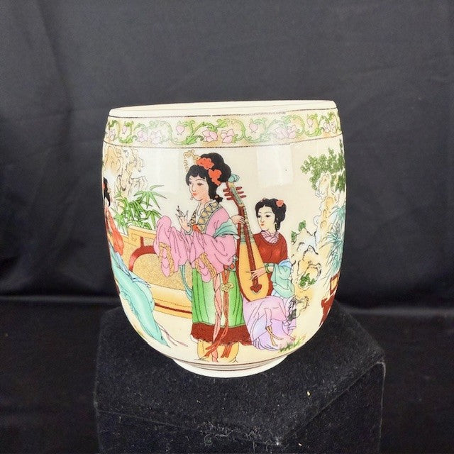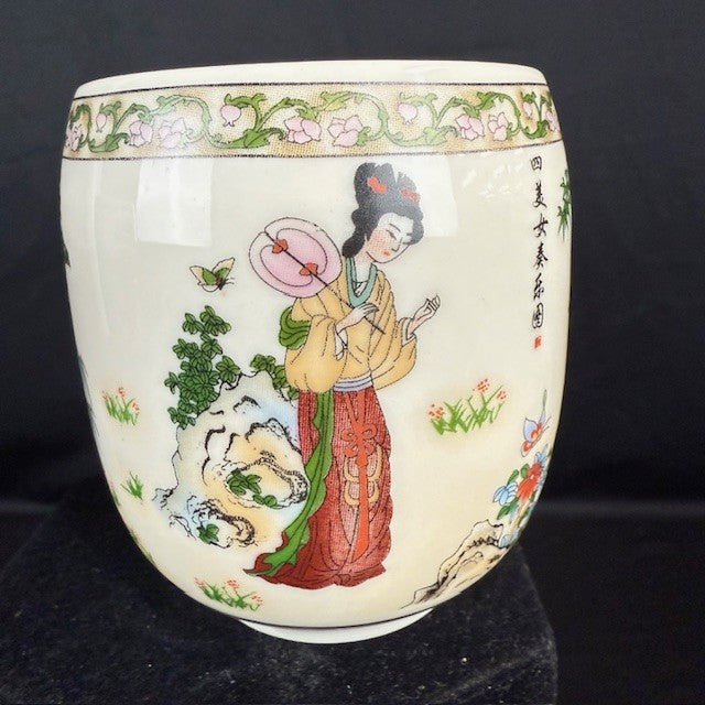 Set of four exquisite hand-painted porcelain tea cups featuring traditional Asian artwork of geisha figures. Each cup showcases detailed, colorful scenes of elegantly dressed figures in traditional attire amidst serene natural landscapes with floral accents. Measuring 3"H x 2.5"W. All in great condition.