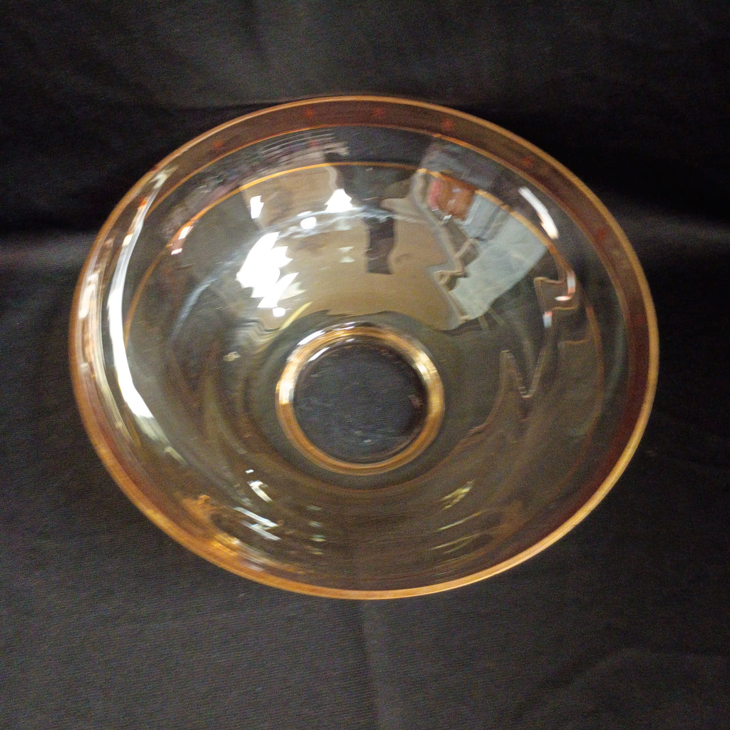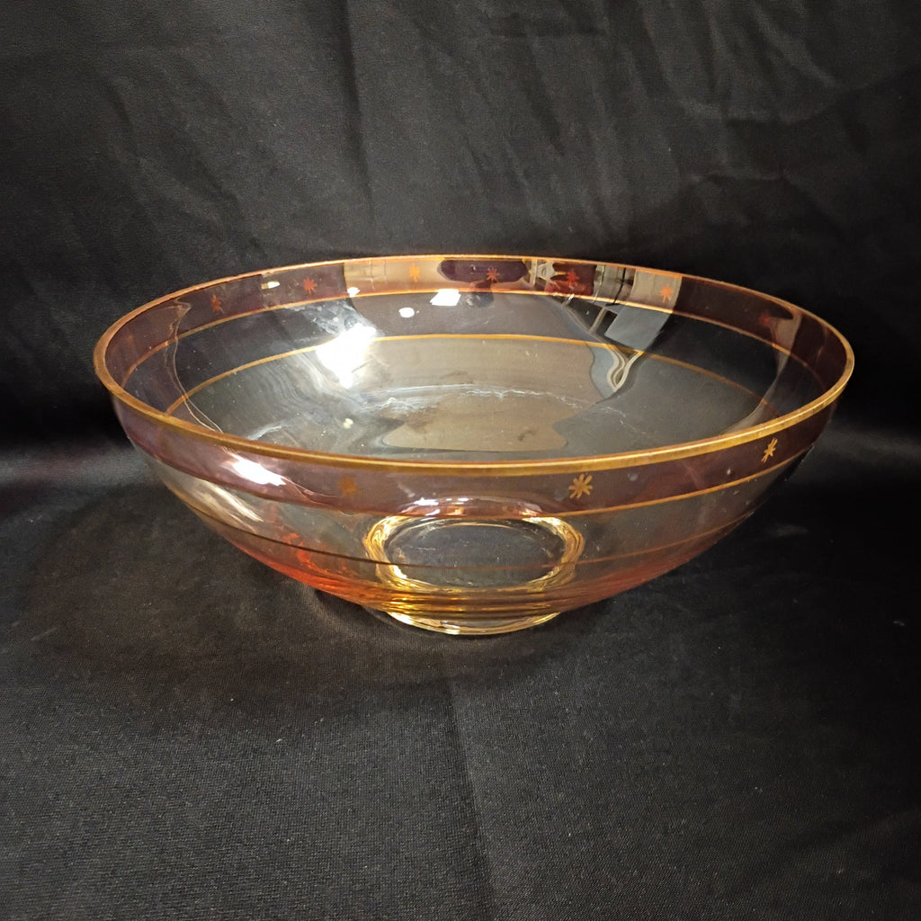 Vintage rose pink serving bowl with gold accents. Iridescent carnival glass. Dated mid century. Measures 4"H x 10"W. Small chip on the rim, in otherwise great condition.