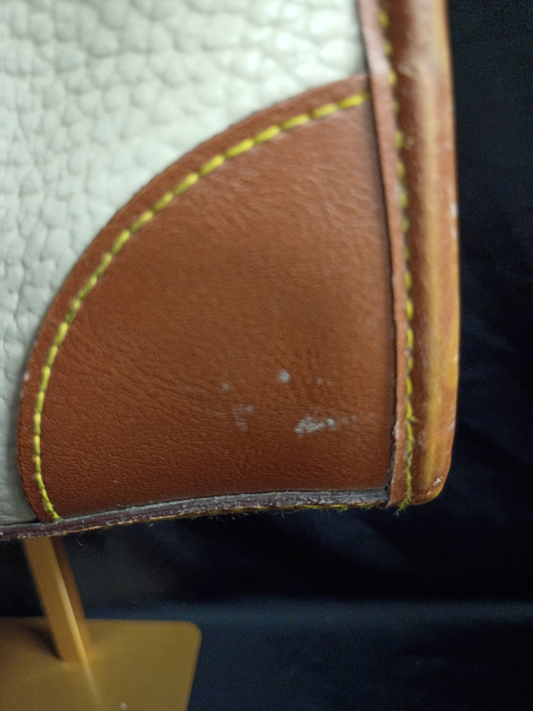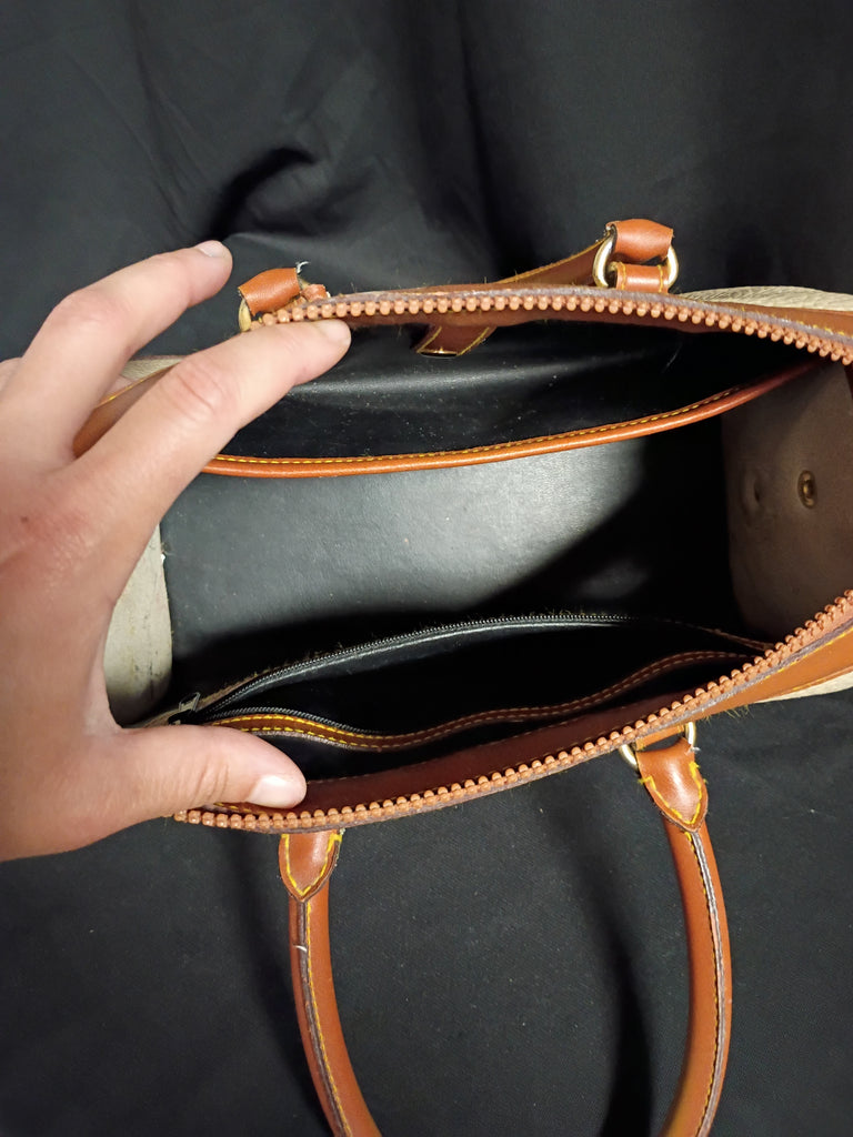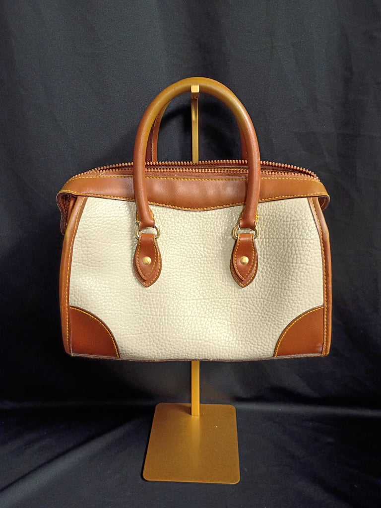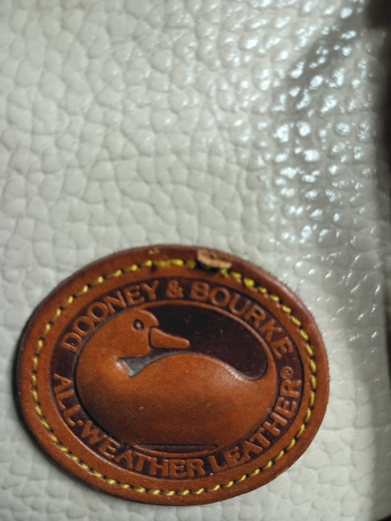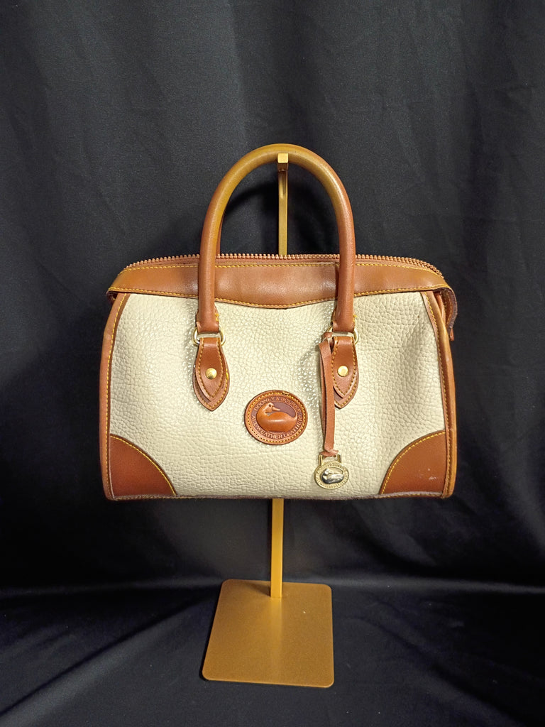 Vintage Dooney and Bourke Handbag. Beige and brown leather with signature duck logo on the front. Measures 11"L x 5.5"W x 8"H. Small imperfections (see photos). But in overall great condition.