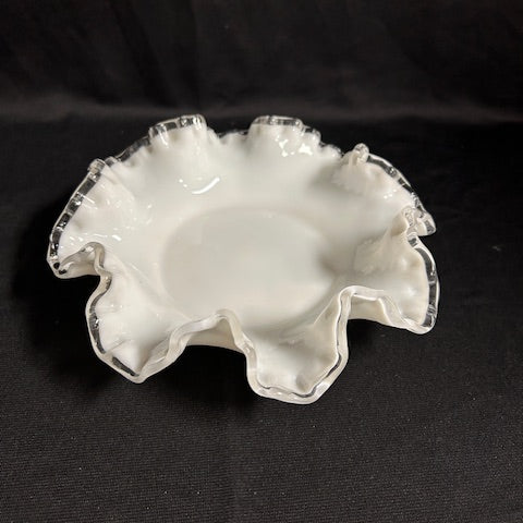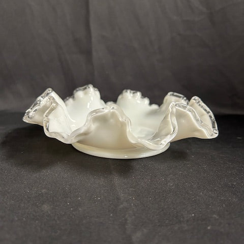 Beautiful Fenton milk glass candy dish. Crimped ruffle edge. Hand blown from the 1950s. Excellent condition. Measures 2"H x 8"W.