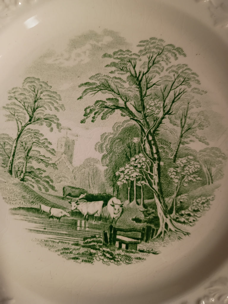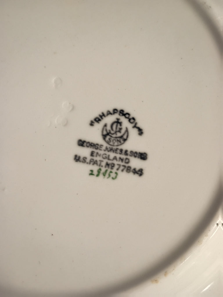 Vintage George Jones & Sons Salad/Luncheon Plates. Provincial illustration in green and white in the middle. Made in England. Each measures 9" dia. All in great condition.