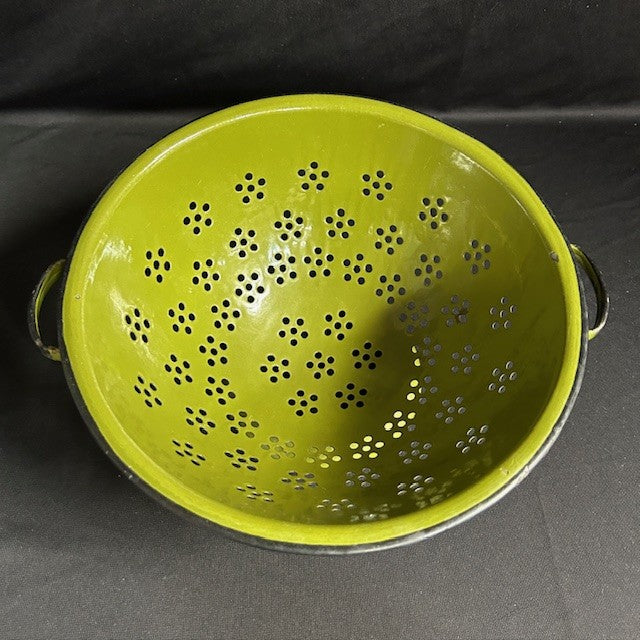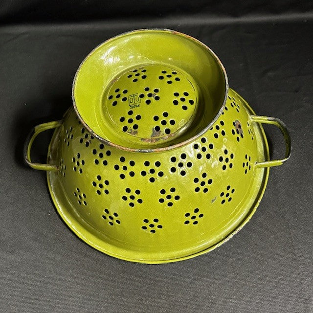 Vintage Hunter Green Enamel Colander measuring 12" wide (with handles) and 5" T. In very good condition. Made in Japan.