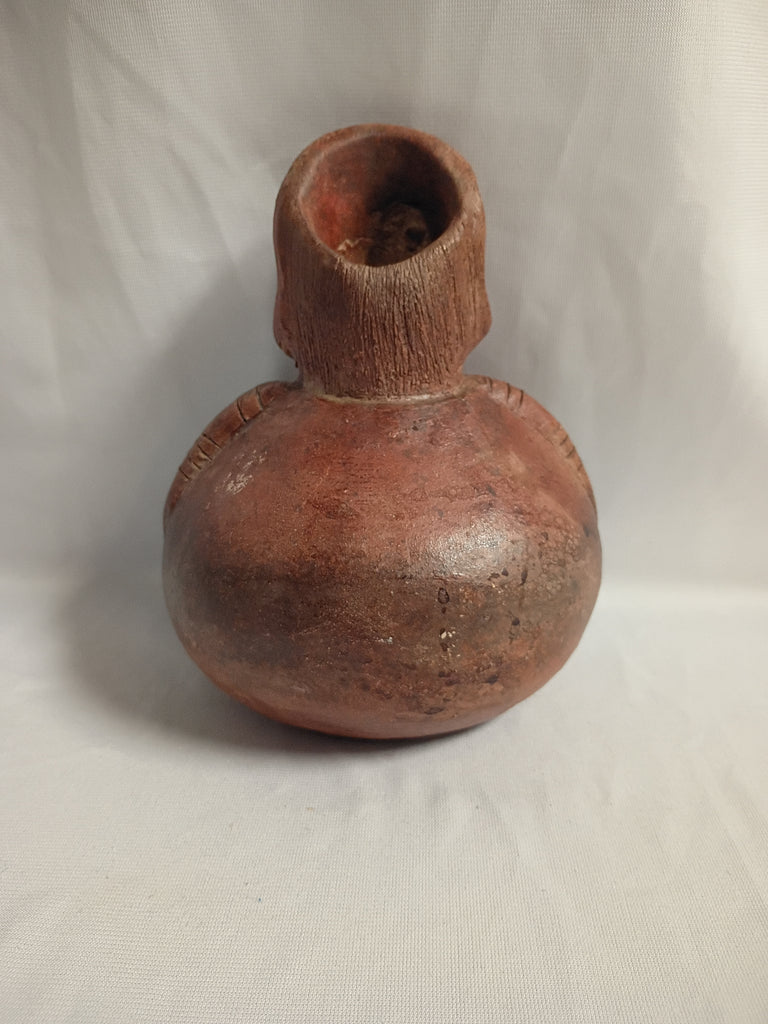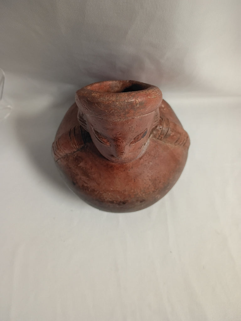 This vintage pottery vase from Mexico is a beautiful representation of the pre-Columbian Mayan and Aztec cultures. The figural vase measures 7" H x 5" w and is in great condition.