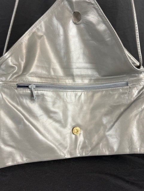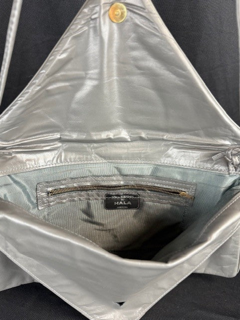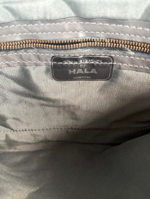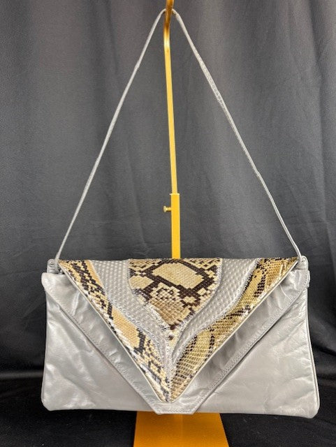 Vintage Hala brand gray leather rattlesnake skin purse. Measures 14" w x 9" h. In excellent condition.