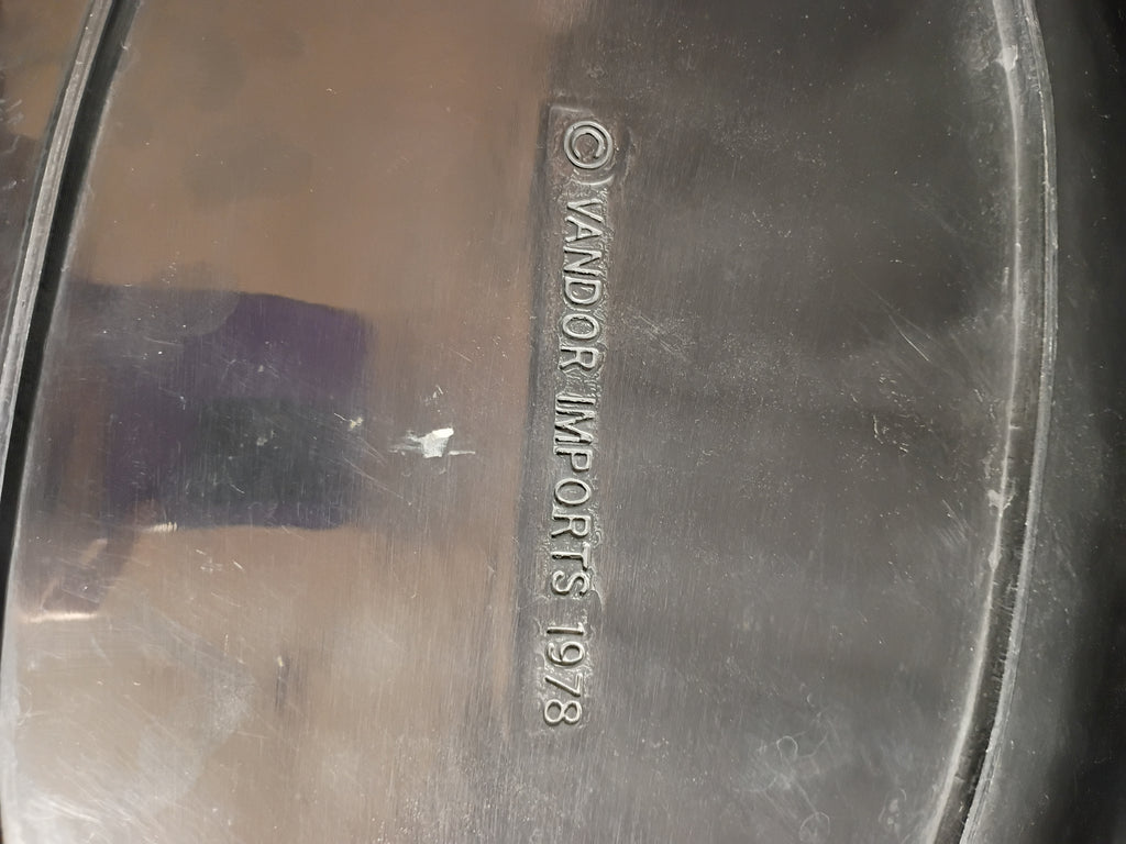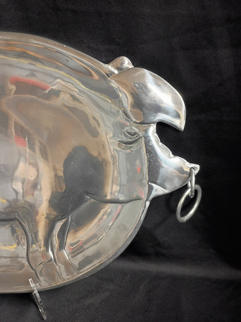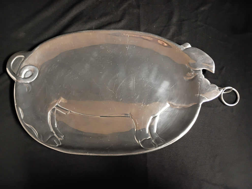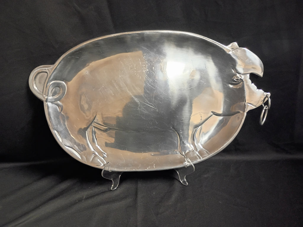 Vintage Cast Aluminum figural pig platter by Vandor Imports. Crafted in 1978, this large swine shaped plate measures 19"L x 11.5"W. Minor wear as pictured but in overall excellent shape.