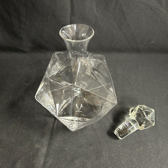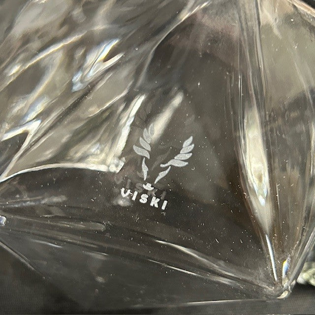 This is the Seneca Faceted Crystal Whiskey Decanter by Viski. The bottle is a 20-sided (trigonal) polyhedron-shaped, lead-free crystal vessel designed for storing and serving liquor. Comes with matching stopper. In great condition. Measures 9.5"H x 5"W.