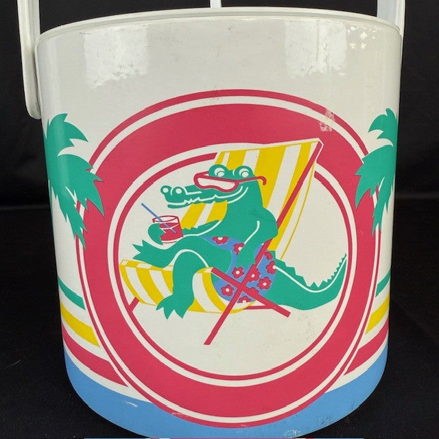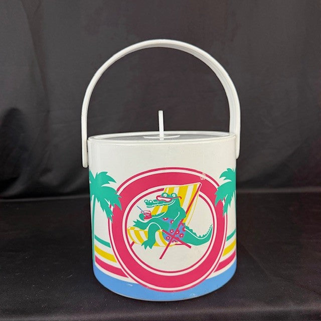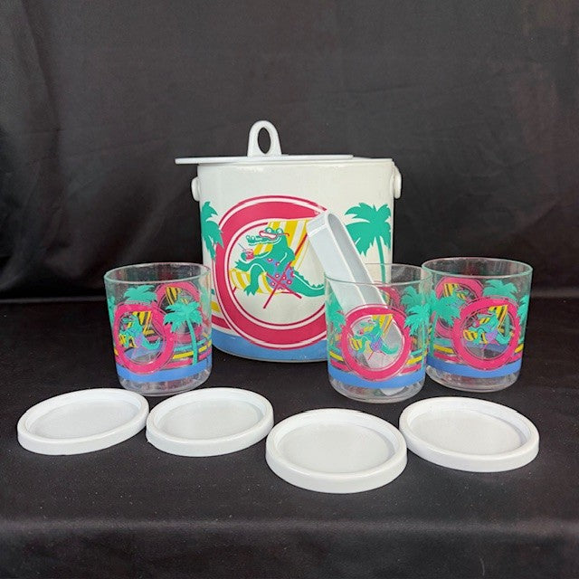 Vintage 1980s Retro 10 pc Ice Bucket Fun Pool Party Beverage Set: Includes 3 Cups ; 4 coasters and one set of tongs. In very good condition. Measures Bucket: 7.5"H x 7.5"W, Cups: 4"H x 3.5"W.