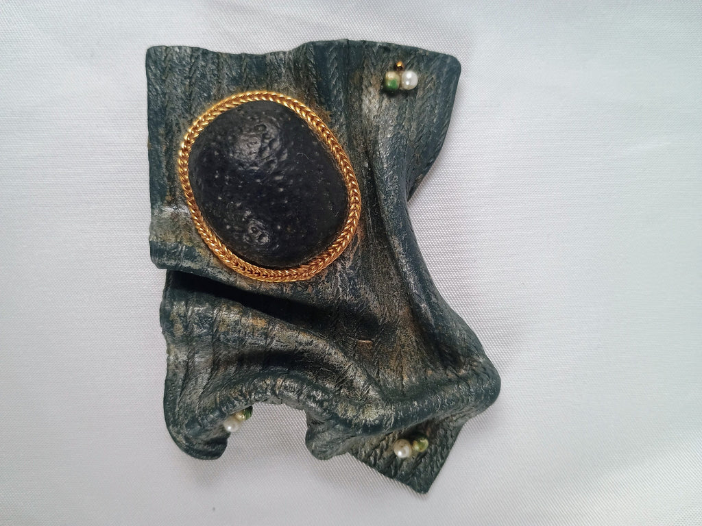Lovely hand crafted abstract brooch made of clay. Features a rippled design with black textured cabochon off to the side. Measures 3"L x 2"H. In great condition.