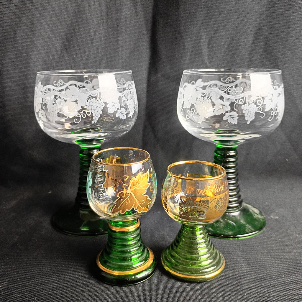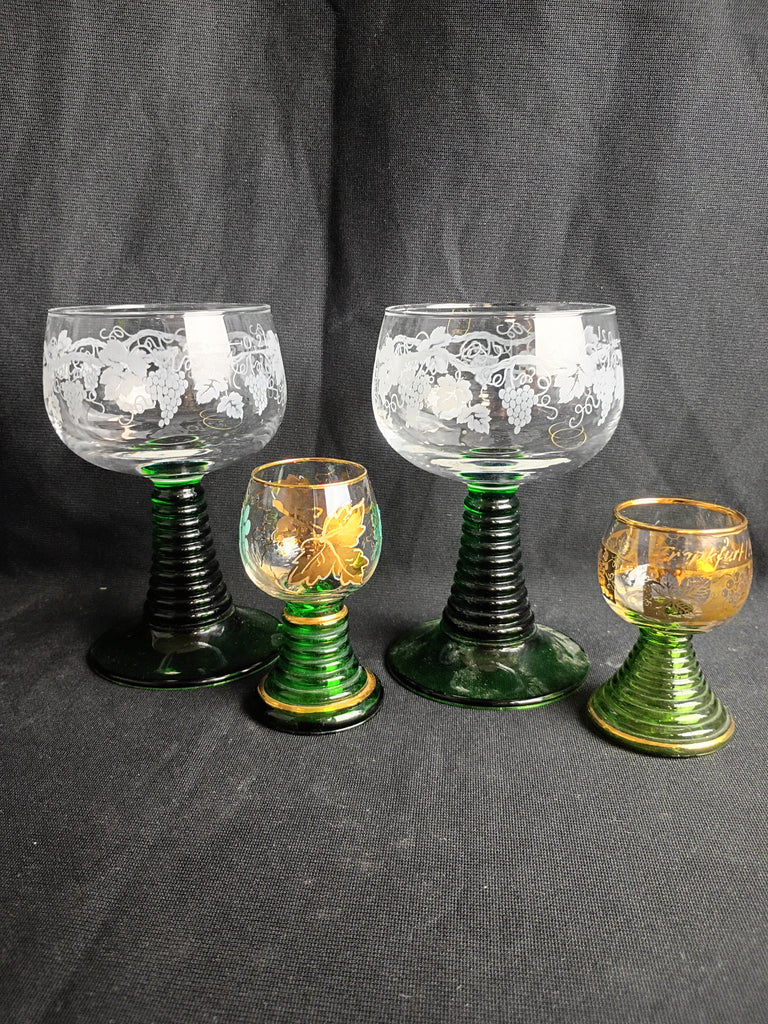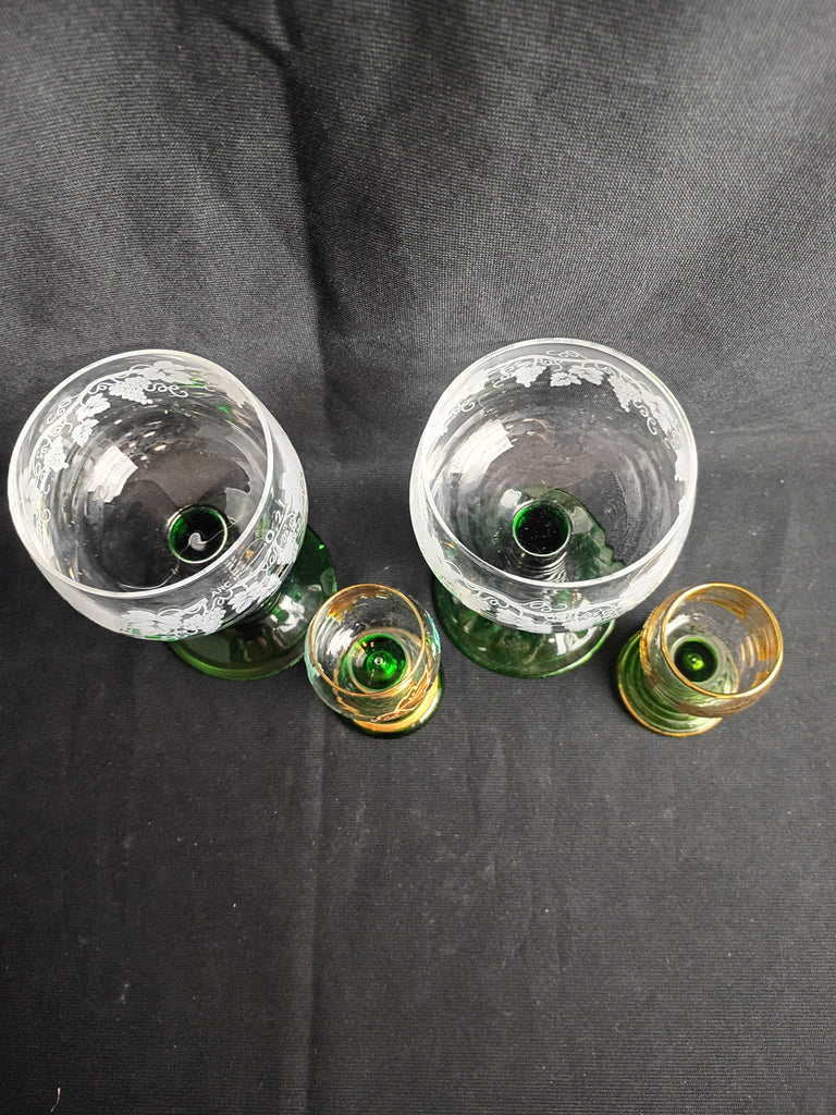 Set of 4 glasses: 2 wine goblets, and 2 cordials or shot glasses. The cordials are souvenirs from Germany, the wine goblets are attributed to Luminarc, France. All have the lovely beehive emerald green stems, making for a charming set. The cordials have a bit of paint loss, but otherwise all glasses in great condition. Wines measure 5.5"H x 3.25"W, and the cordials appx 3"H x 2"W.