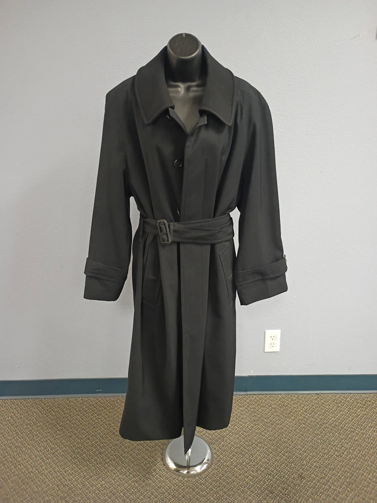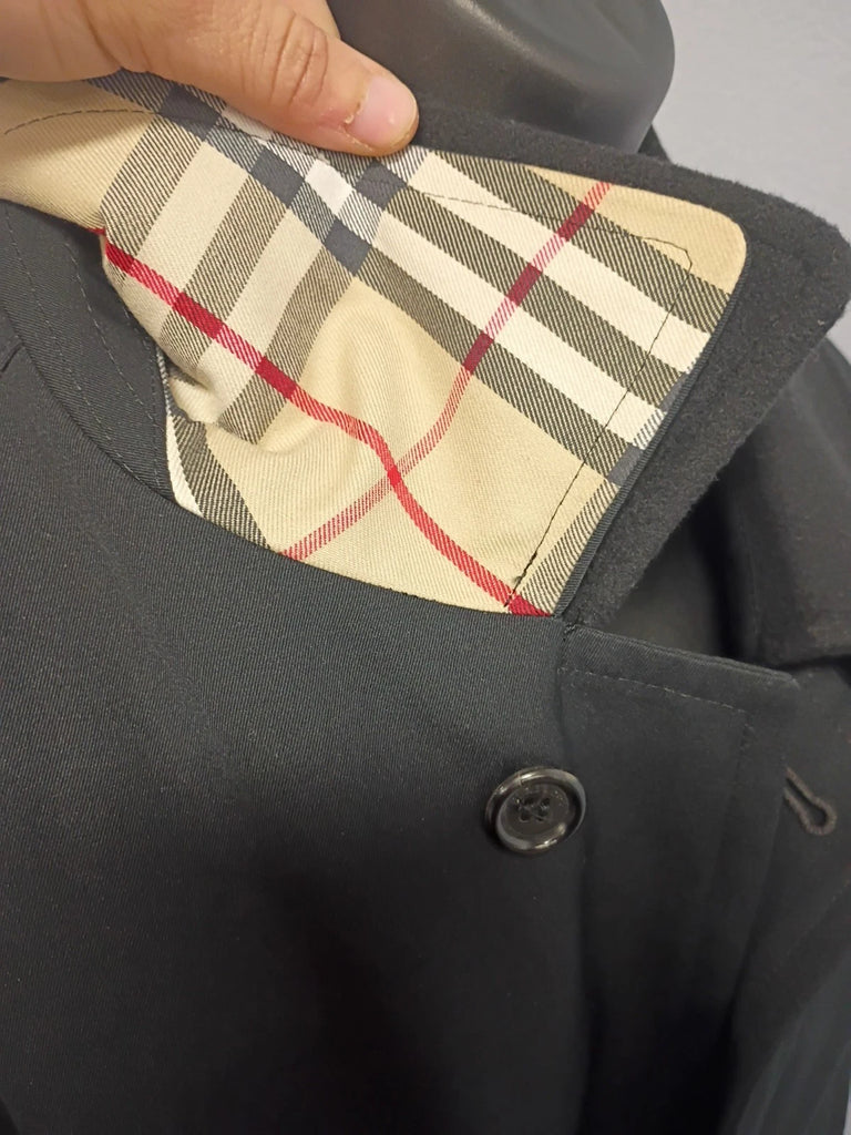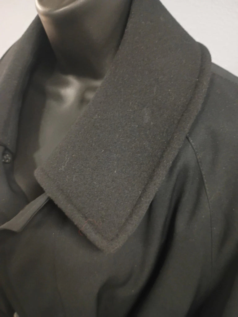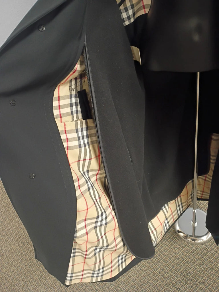 Excellent condition, what a find! Black Burberry jacket.  Beautiful piece to wear from day to evening. Full length belted trench coat. Polyester with classic nova check lining. Removable zippered liner crafted from 95% wool and 5% camel hair. In great condition. Only flaw is some small stains on the belt and on the collar (see photos). Measurements are 20"L shoulder to shoulder, 22"L armpit to armpit and 46"L shoulder to hem.