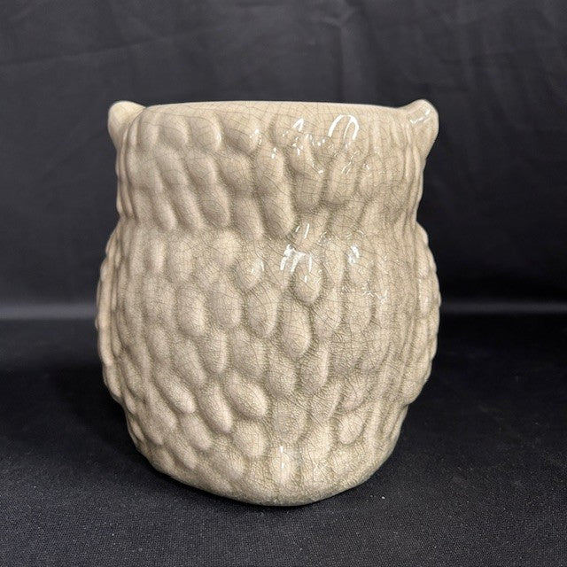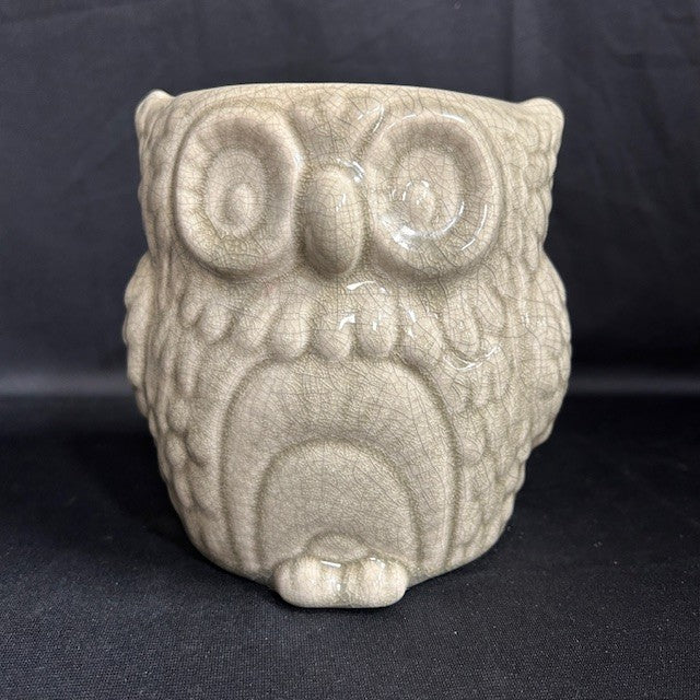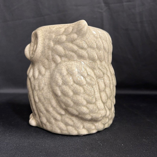 This crackle grey ceramic owl could be used as a flower pot, vase or for utensils. Has four rubber feet so your surfaces won't get scratched. Very good condition. Measures 6"H x 5"W.