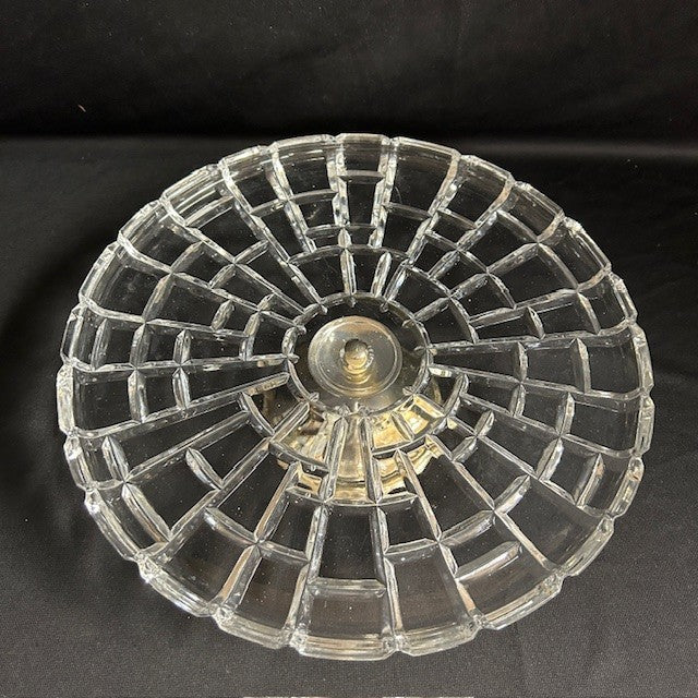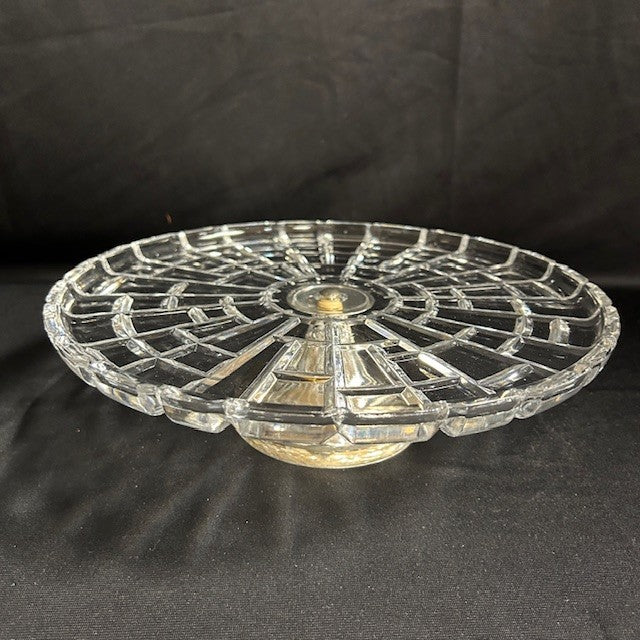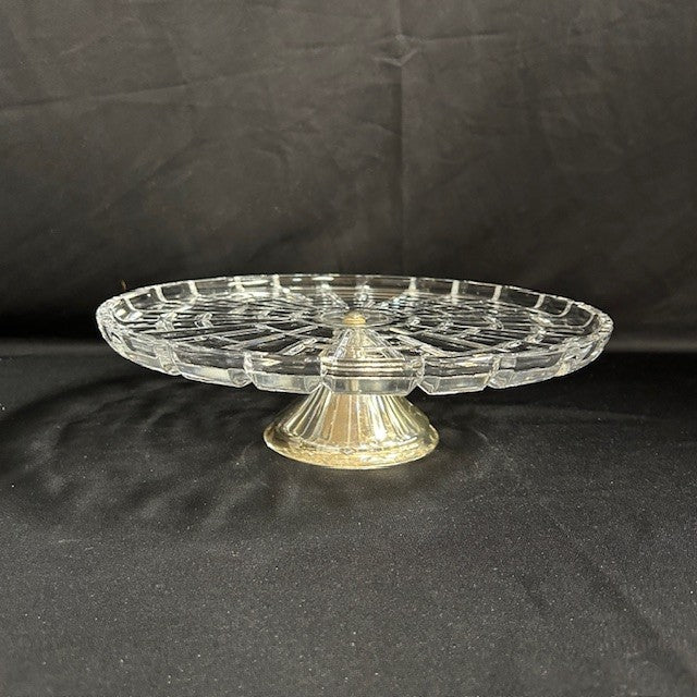 Crystal cake plate with silverplate stand. Attributed to Godinger Crystal. In great condition. Measures 12"W x 3.5"H.