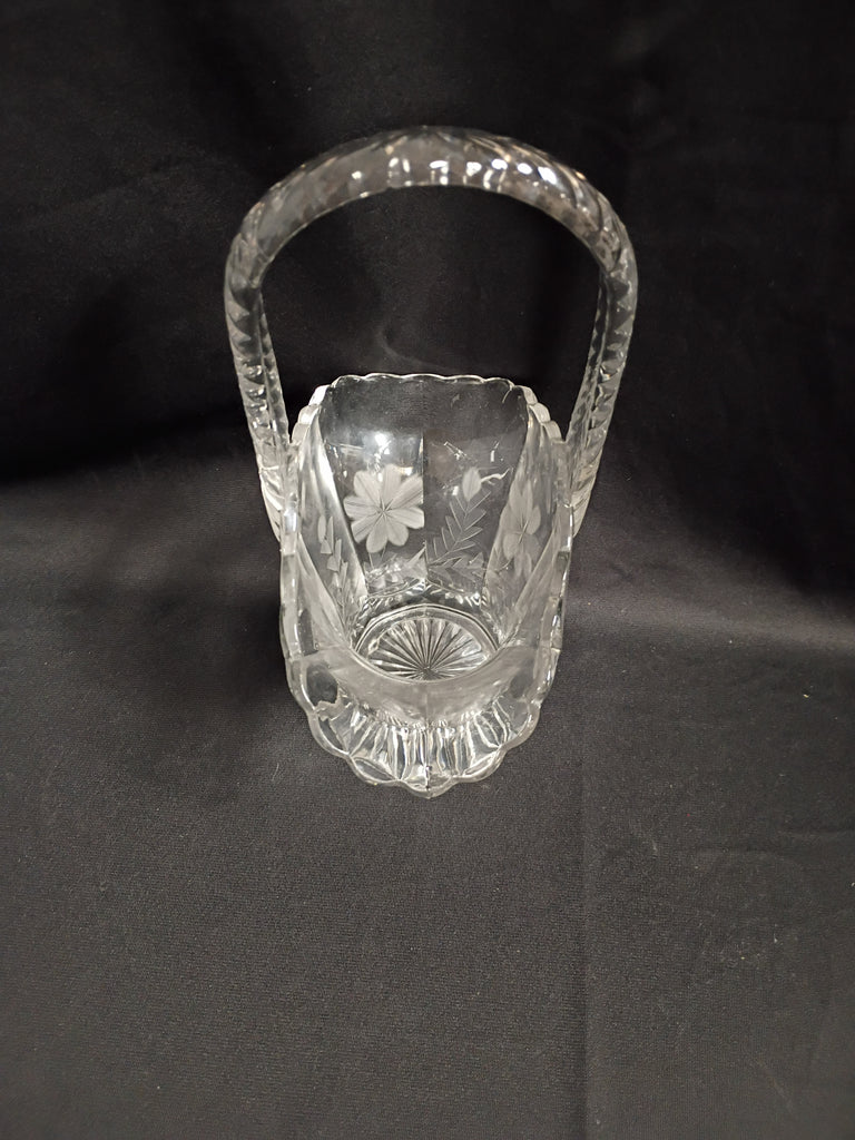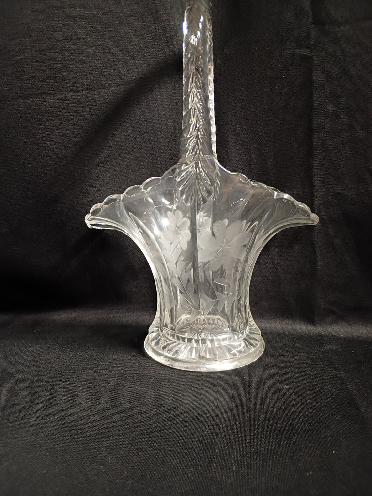VTG etched glass basket with floral details. Measures 7.75"L x 4"W x 12"H. In excellent condition.
