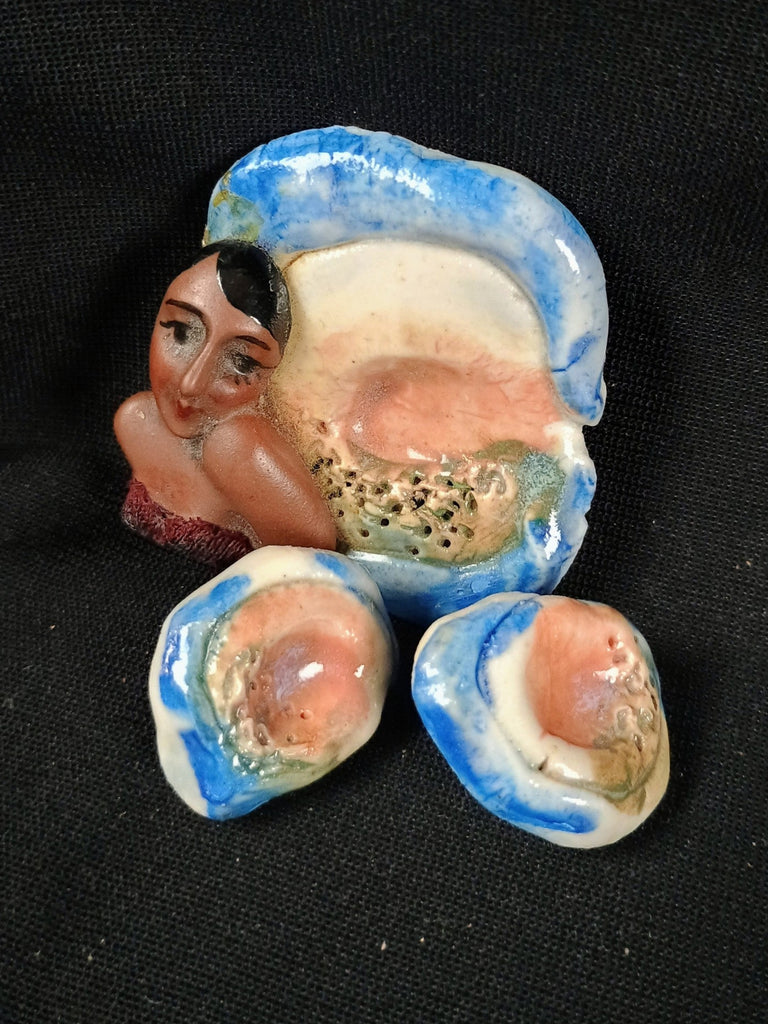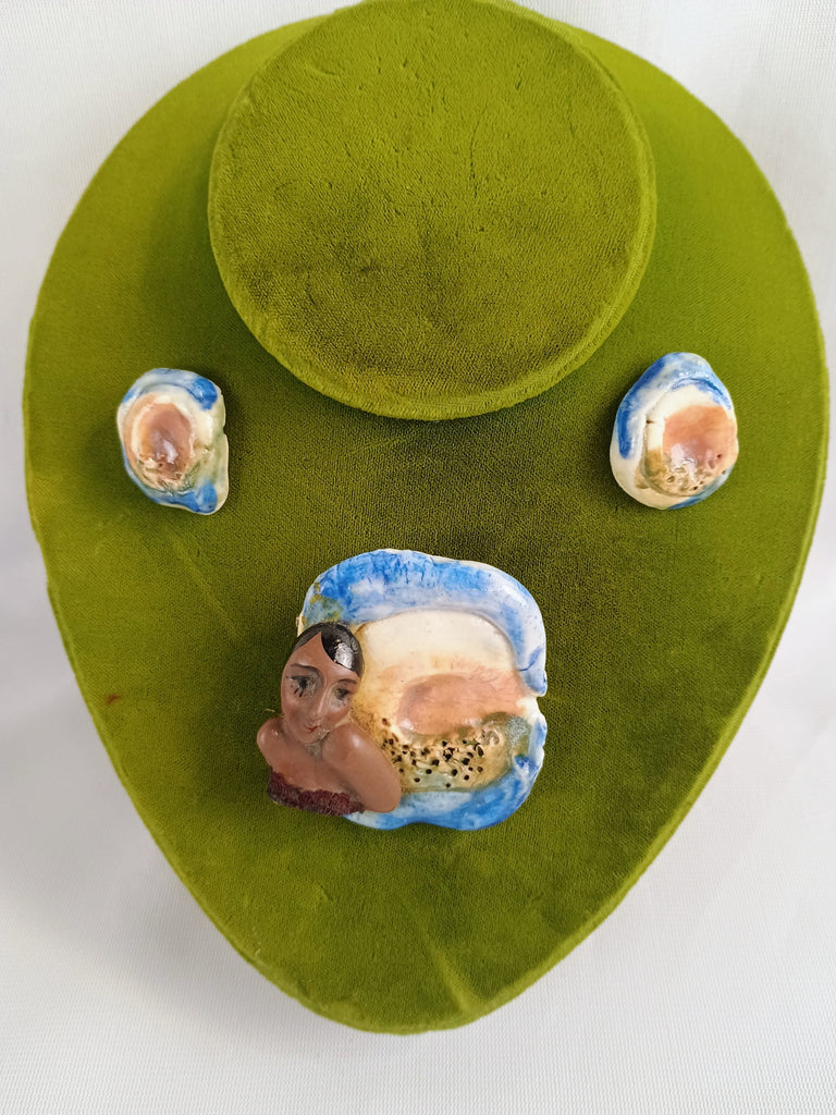 Lovely handmade art pottery earrings and brooch set. The woman appears to be the spitting image of Josephine Baker, or perhaps a nameless gorgeous flapper. Brooch measures 2"L x 2"W, and the earrings are 1" diameter. All in great condition.