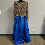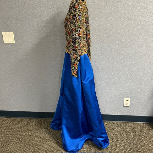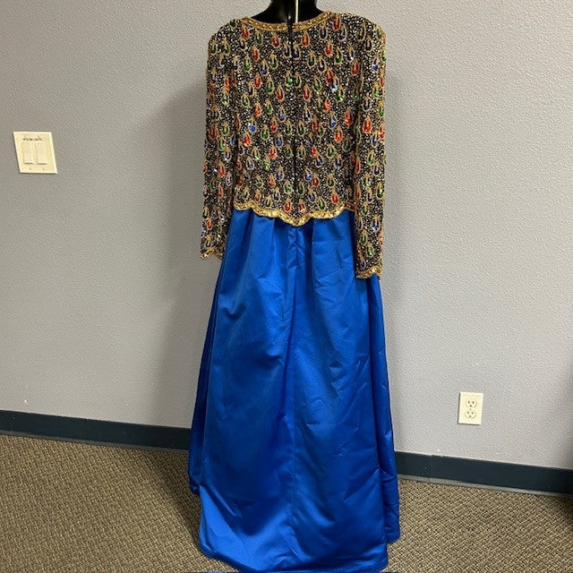 Royal blue satin skirt with teardrop beaded multicolored top. In mint condition. Measurements are 16" shoulder to shoulder, 18" armpit to armpit, and 55" shoulder to hem.