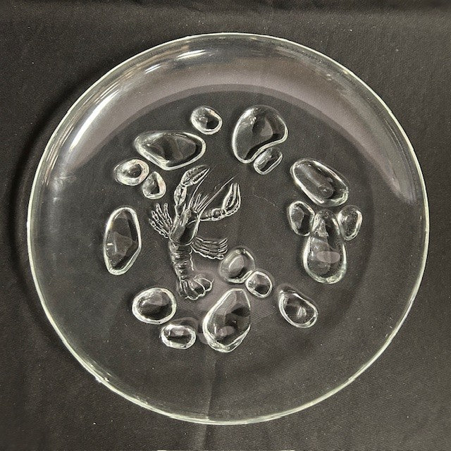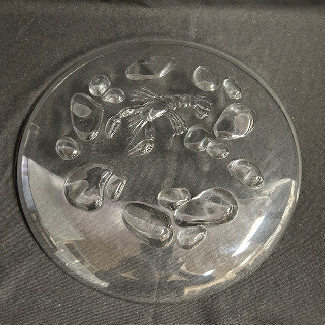 Glass platter attributed to Arcoroc. Lobster and pebble motif. 12" diameter. A few small scratches at the bottom, but in overall excellent condition.