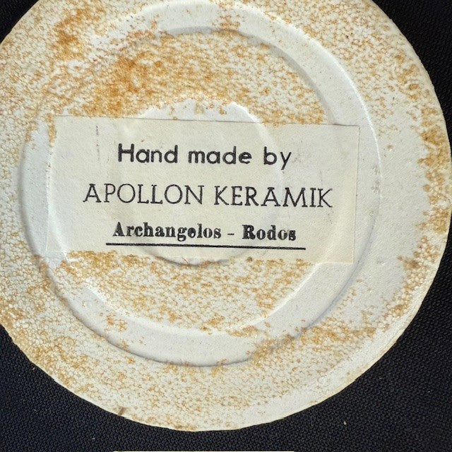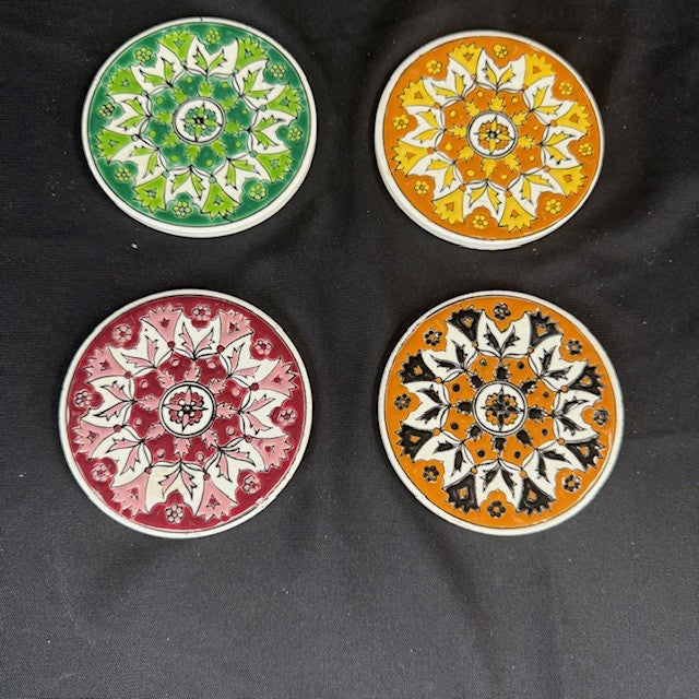 Set of 4 ceramic coasters from Apollon Keramik based in Archangelos Rodos, Greece. All in great condition. Hand painted and fired, they feature floral mandala-like patterns. Each measures 3.75"W.
