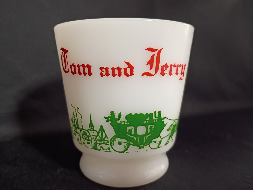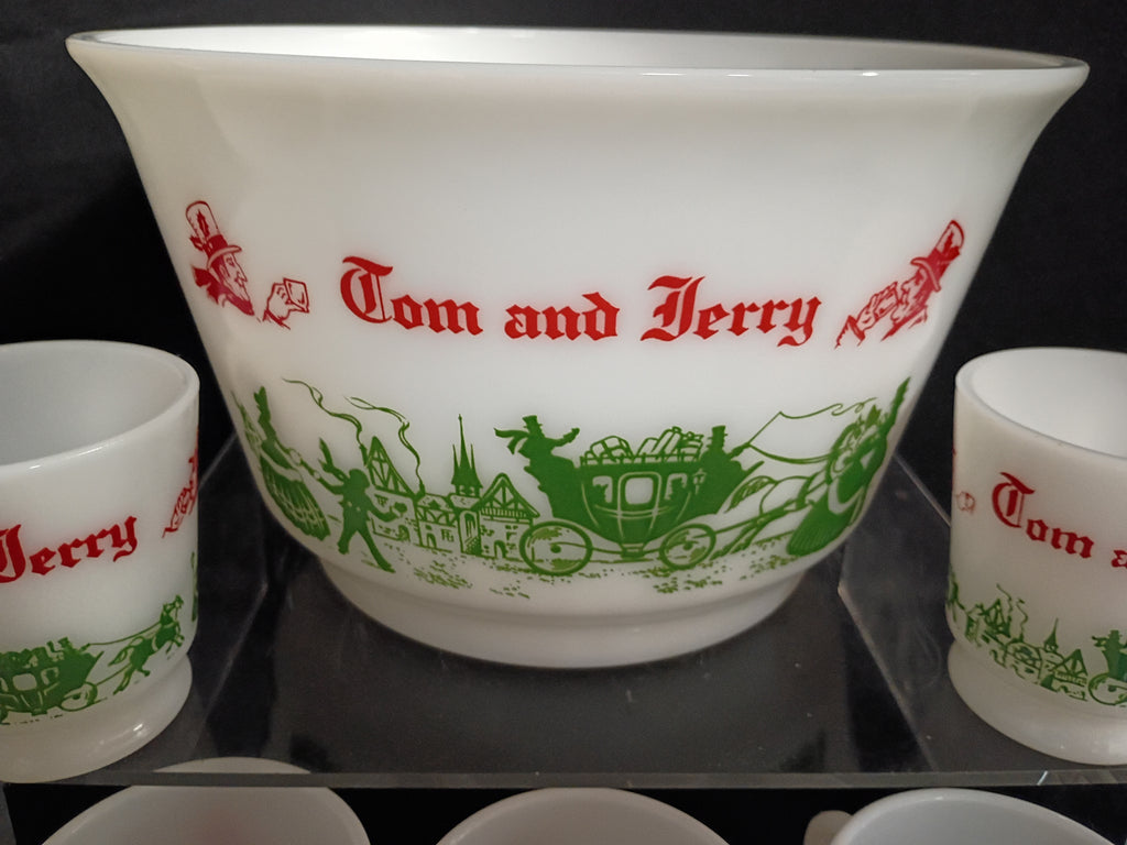 Vintage milk glass punch bowl and cups intended for everyone's favorite holiday drink, "Tom & Jerry". Comes with 10 mugs each measuring 4" L (includes handle) x 3"W x 3"H, and the bowl measures appx 6"H x 9.5"W. Victorian style horse and carriage winter scene on each piece. In great condition.