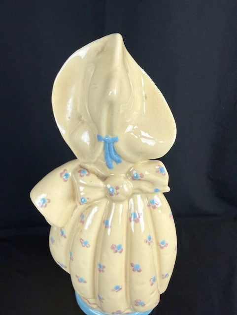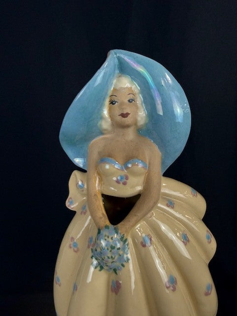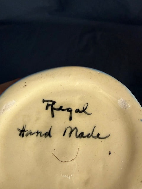 Good condition, does show some wear on top of body and face. Unusual find of the 1940"s-50" to show a flower as a center piece! It is marked on bottom "Regal Handmade" Not sure if it's part of the Regal Crown Co. Great conversation piece, hat makes the whole Vase. Measurements are 10"H. by 5" W.