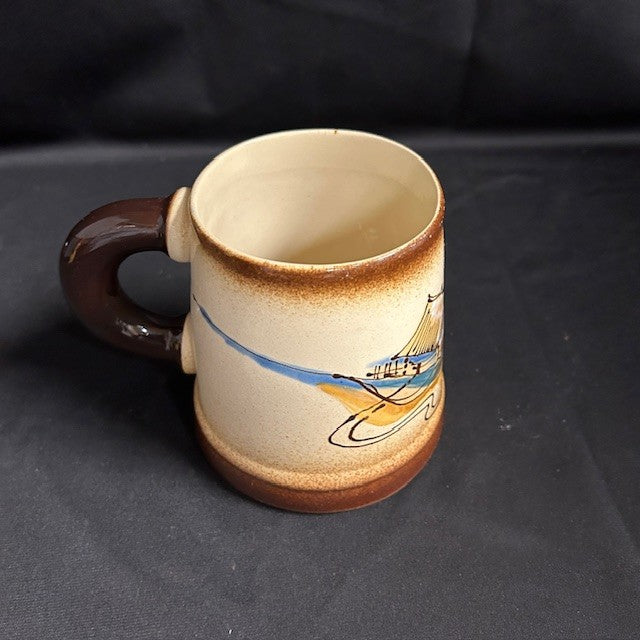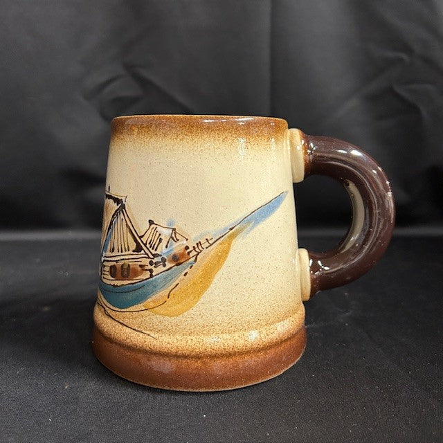 This mug, likely from a Japanese manufacturer, features a hand-painted rustic landscape design. Measures 5"H x 4"W. In great condition.