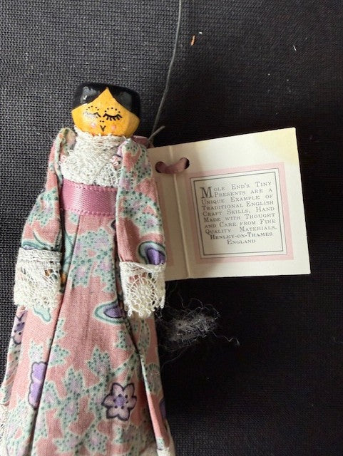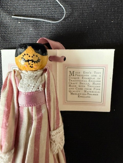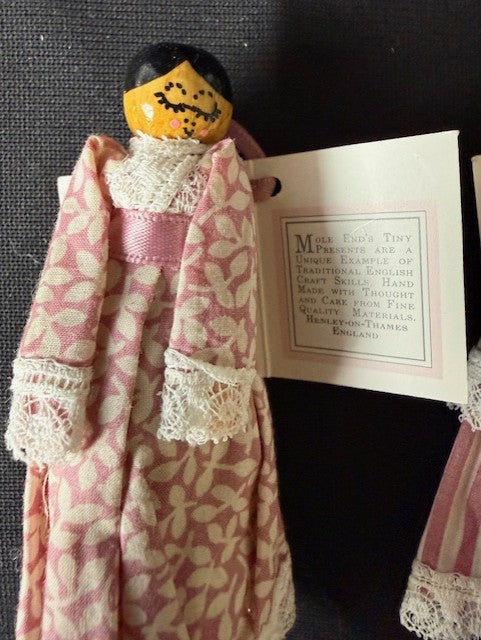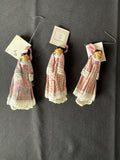 Beautiful Xmas ornaments or simple ornaments for other occasions. Made in England. Mole end dolls. Set of 3. Each is about 2-3"L.