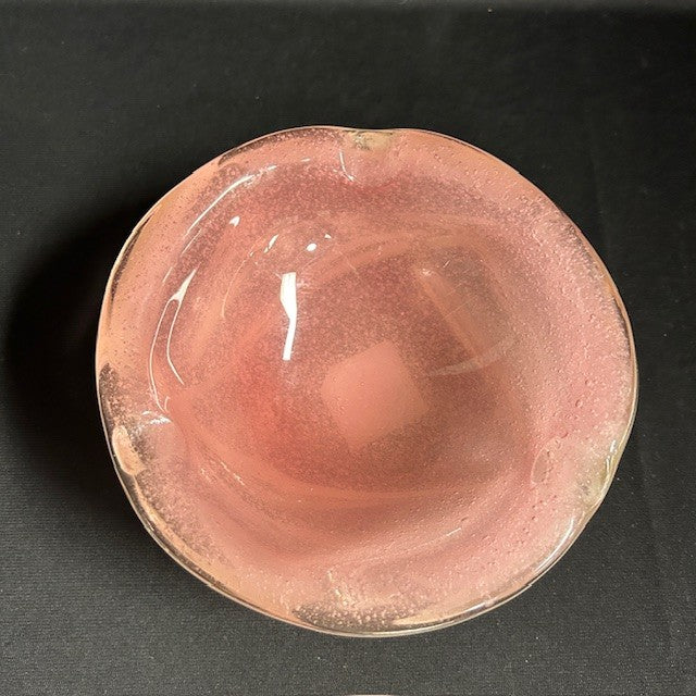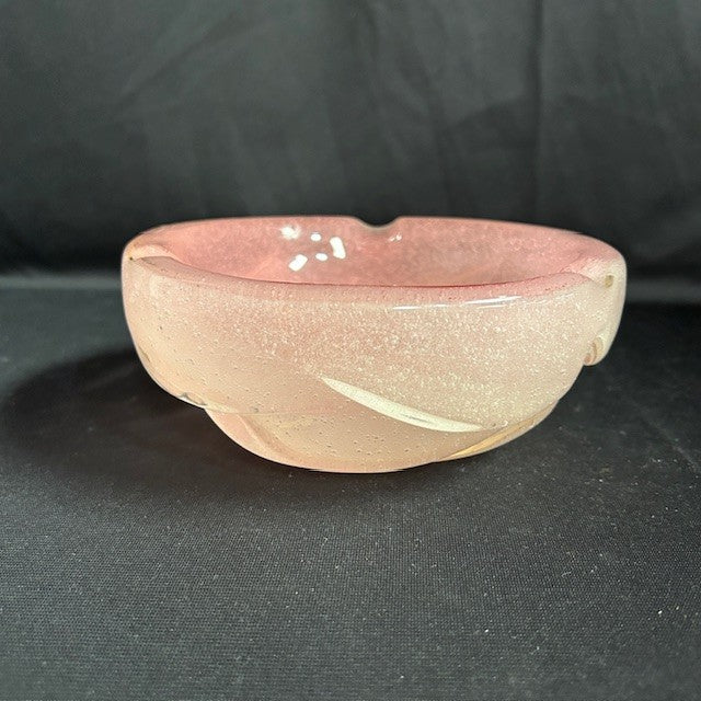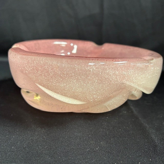Beautiful vintage pink art glass bowled ashtray. Figural rose shape on the bottom and sides. Three indentations for cigarettes. In great condition. Measures 6.75"W x 3"H.