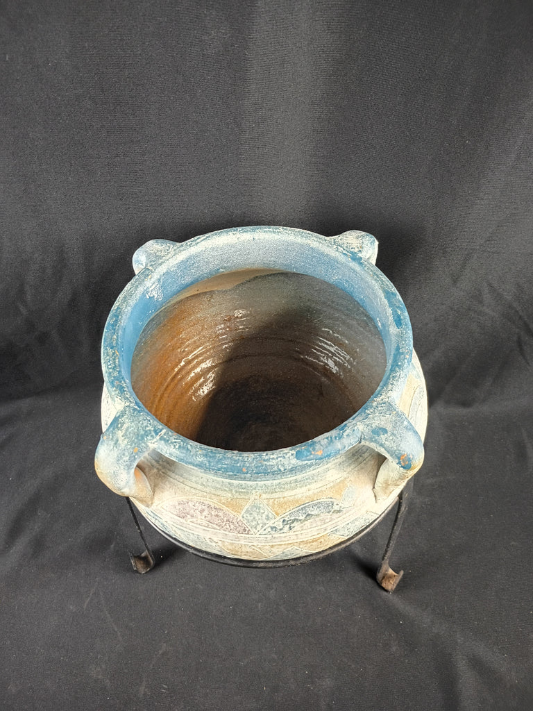 Art pottery vase with River Junction Pottery vessel. Southwest style with unique rustic charm. Complete with cast iron stand. On display this piece measures 10"H x 7"W. In excellent condition.