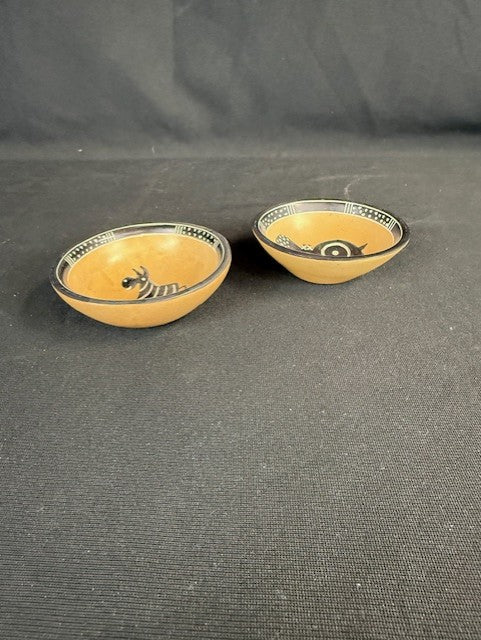 Set of 2 small vintage African trinket bowls. In excellent condition. Hippo and zebra designs. Each is appx 3"W x 1"H.