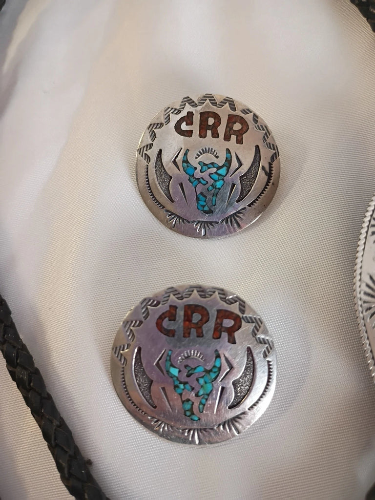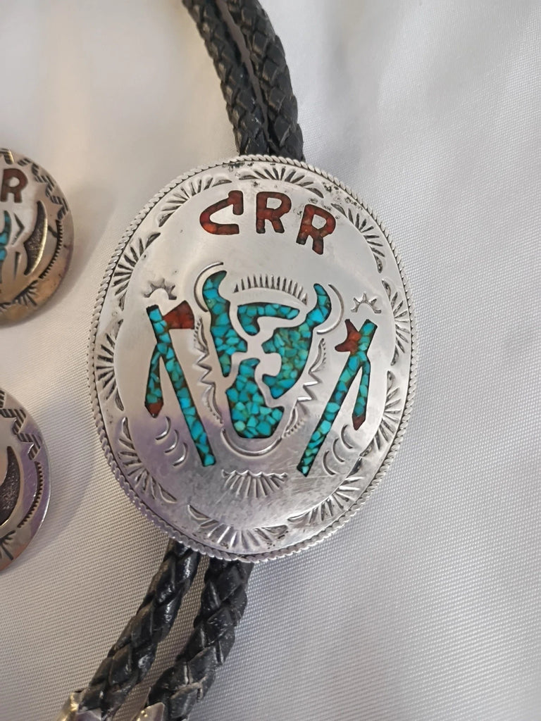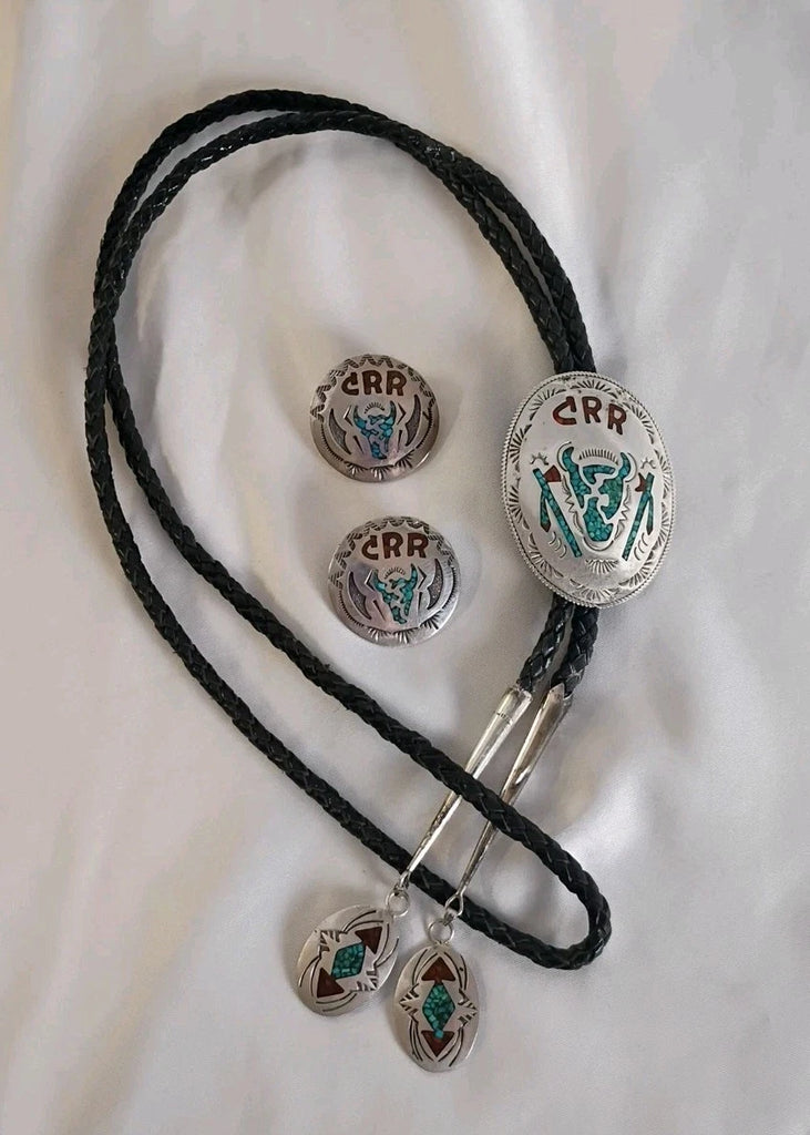 Southwestern jewelry set. Bolo tie & earrings. Sterling silver with turquoise and coral chip inlay. Each reads "CRR"; likely a ranch abbreviation. Bolo has ornate ovular tassels on the tips with the same inlay in tribal patterns. Long horn design on both the earrings and bolo pendant. Bolo is black braided leather and measures 22"L (including tips), pendant is a 2" oval. Earrings each measure appx 1.25" circles. All in superb condition.