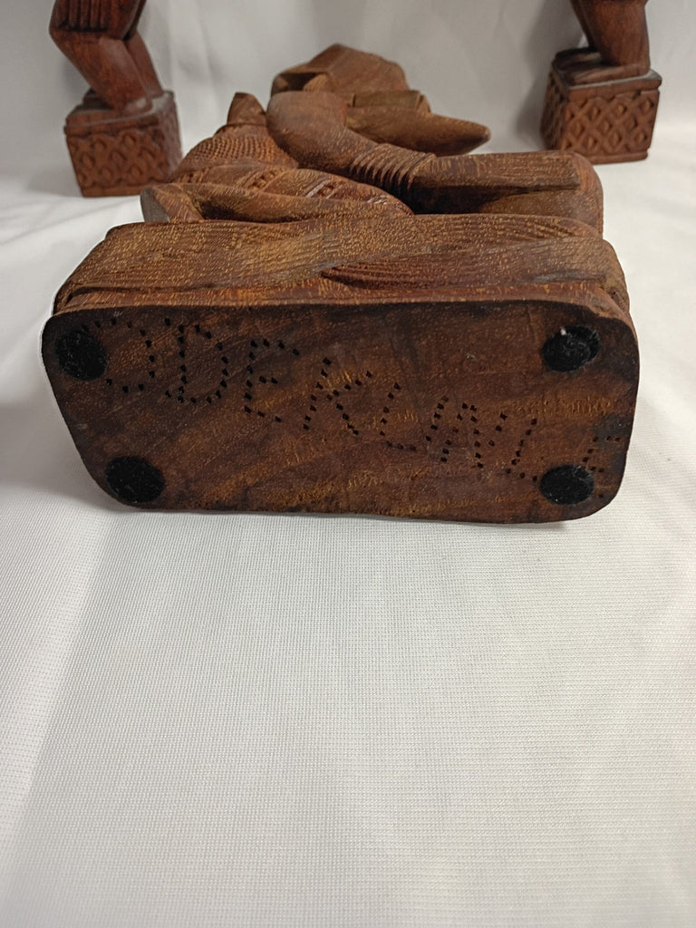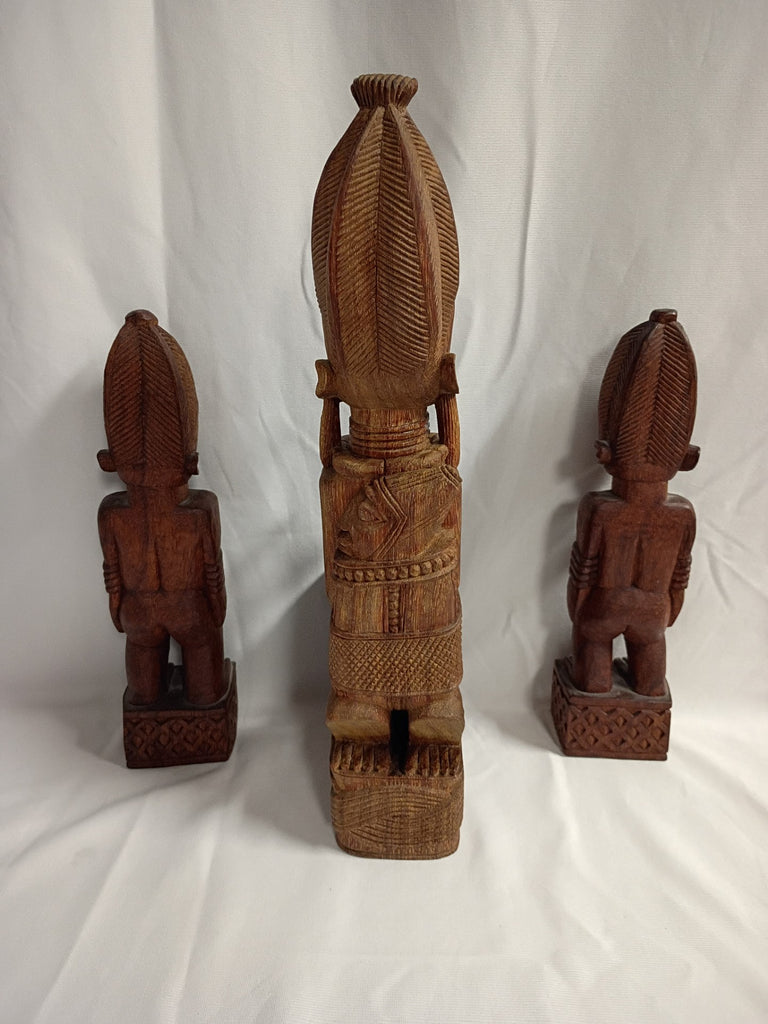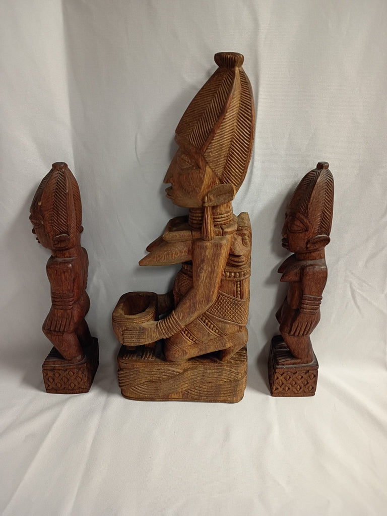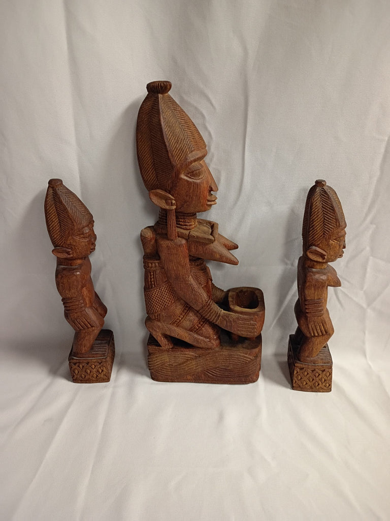Vintage carvings handmade in west Africa by Nigerian artisans. The largest (2.25"L x 5.5"W x 14"H) is a mother holding a bowl, with her child on her back. The two smaller figures (2.25"L x 2"W x 10.5"H) are a woman and man standing with bent knees. All in excellent condition. Largest is signed "Odukunle" on the bottom.