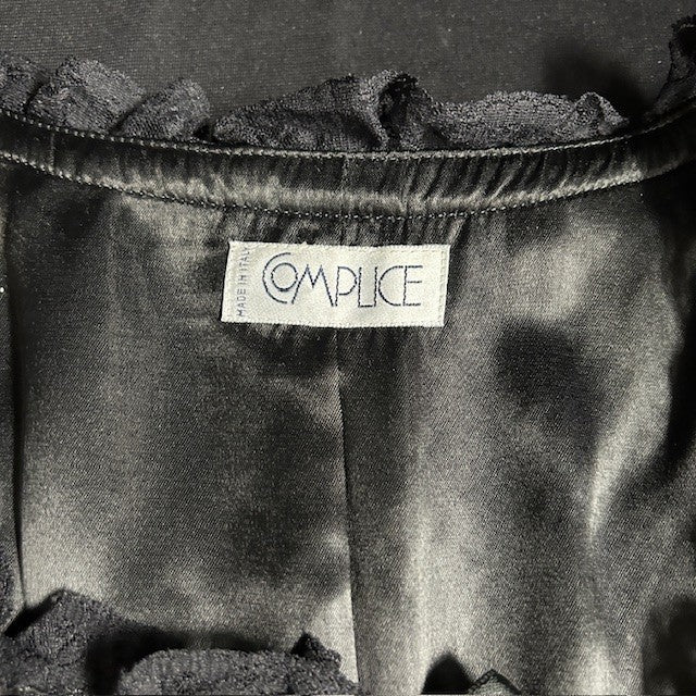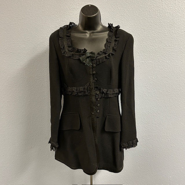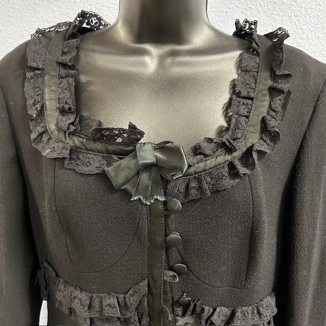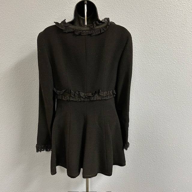 Women's lined black wool top with lace edged cuff, collar, and around the middle. Made in Italy. No size shown. 15.5", shoulder 16", armpit to armpit, 30" shoulder to him.